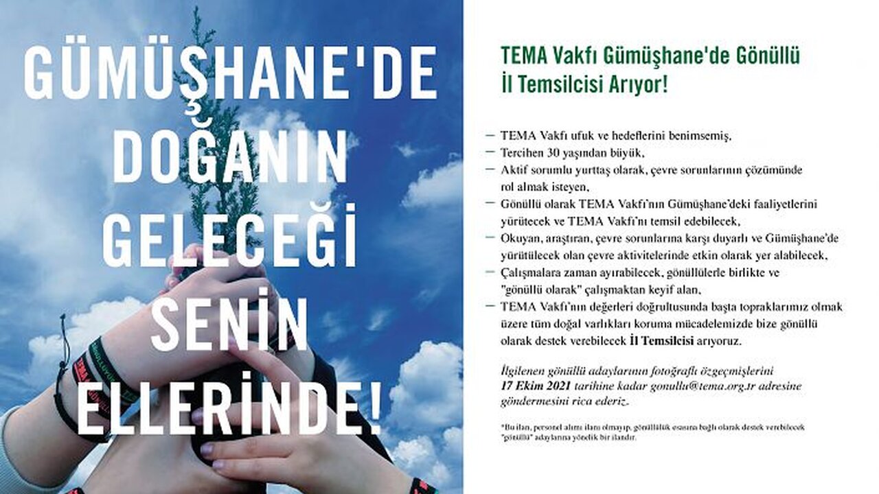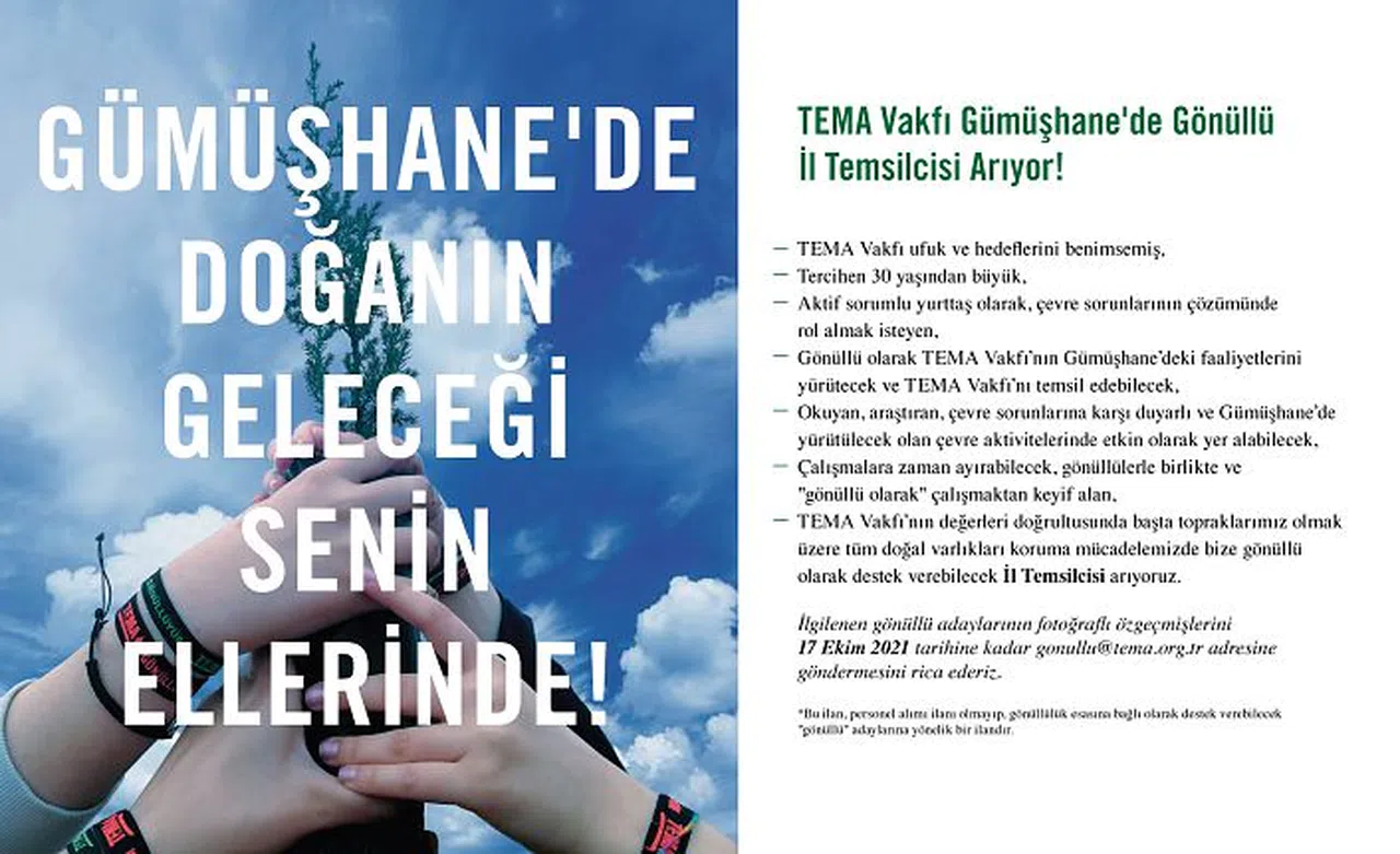 Son başvuru tarihi 17 Ekim 2021 olan ilana göre TEMA Vakfı ufuk ve hedeflerini benimsemiş, tercihen 30 yaşından büyük, aktif sorumlu yurttaş olarak, çevre sorunlarının çözümünde rol almak isteyen, gönüllü olarak TEMA Vakfı’nın Gümüşhane’deki faaliyetlerini yürütecek ve TEMA Vakfı’nı temsil edebilecek, okuyan, araştıran, çevre sorunlarına karşı duyarlı ve Gümüşhane’de yürütülecek olan çevre aktivitelerinde etkin olarak yer alabilecek, çalışmalara zaman ayırabilecek, gönüllülerle birlikte ve "gönüllü olarak" çalışmaktan keyif alan, TEMA Vakfı’nın değerleri doğrultusunda başta topraklar olmak üzere tüm doğal varlıkları koruma mücadelesinde gönüllü olarak destek verebilecek İl Temsilcisi aranıyor.