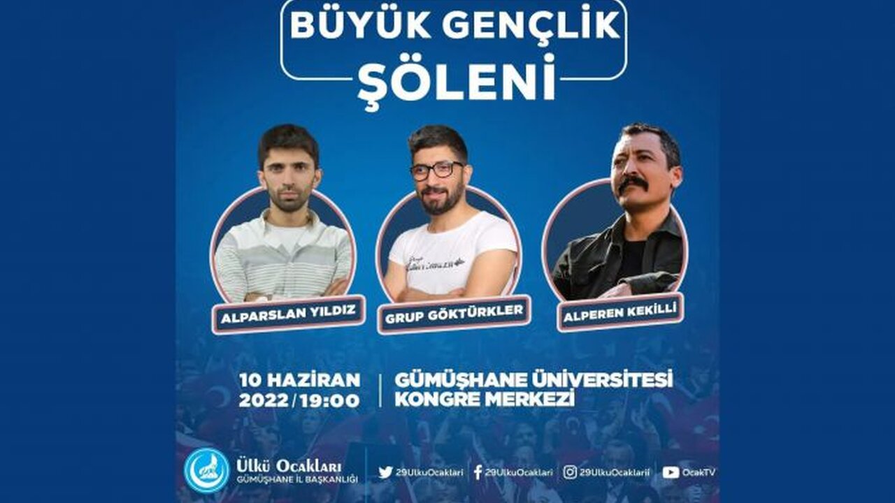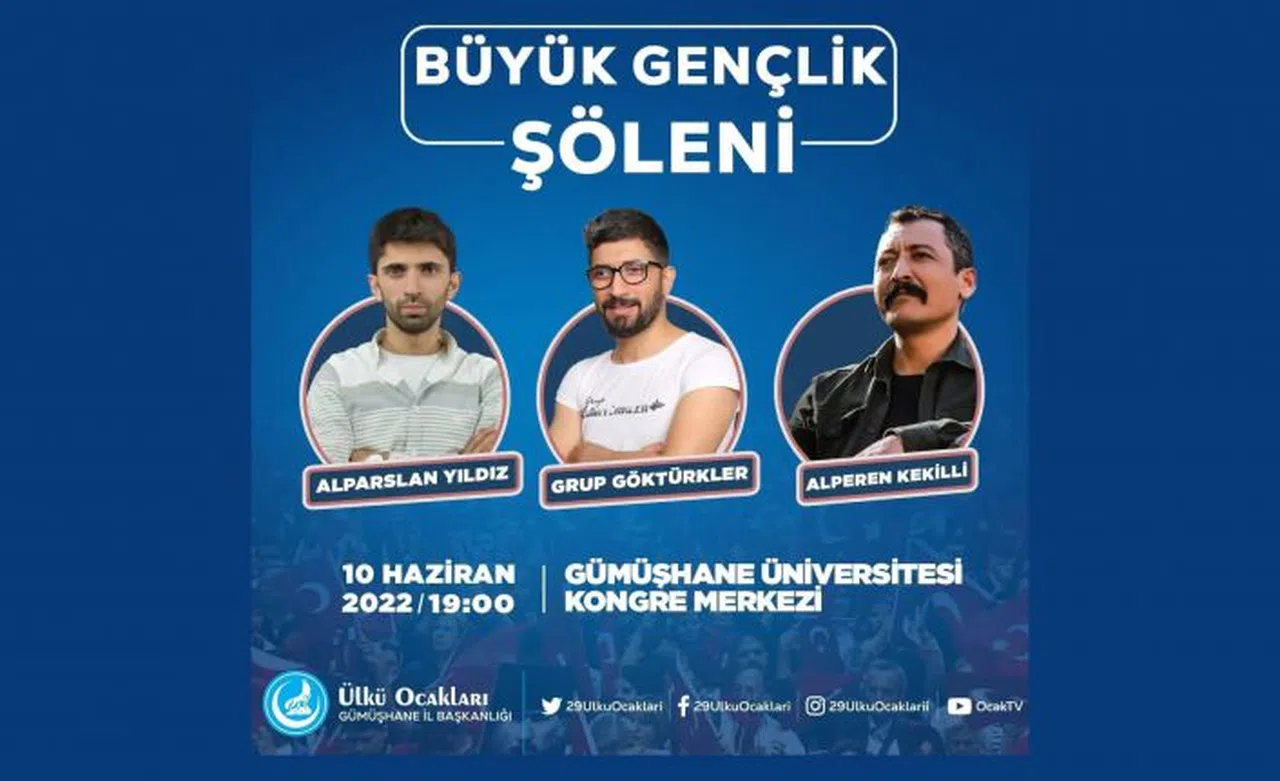 Gümüşhane Üniversitesi Kongre Merkezinde düzenlenecek etkinlikte Milliyetçi Ülkücü hareketin yetiştirmiş olduğu Türkiye’ye mâl olmuş önemli sanatçılar Alperen Kekilli, Grup Göktürkler ve yerel sanatçımız Alparslan Yıldız sahne alacak.
