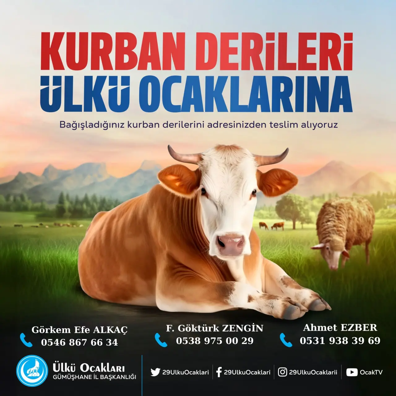 Büyükbaş hayvanların kurban derisini Ülkü Ocaklarına vermek isteyenler Görkem Efe Alkaç (0546 867 66 34), Göktürk Zengin (0538 975 0029) ve Ahmet Ezber’e (0531 938 3969) ulaşabilir.