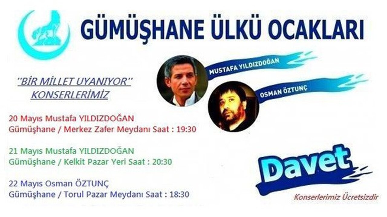 Gümüşhane Ülkü Ocakları İl Başkanlığı, 20-21-22 Mayıs tarihlerinde Gümüşhane Merkez, Kelkit ve Torul ilçelerinde ‘Bir Millet Uyanıyor’ teması ile Mustafa Yıldızdoğan ve Osman Öztunç Konserleri düzenleyecek.