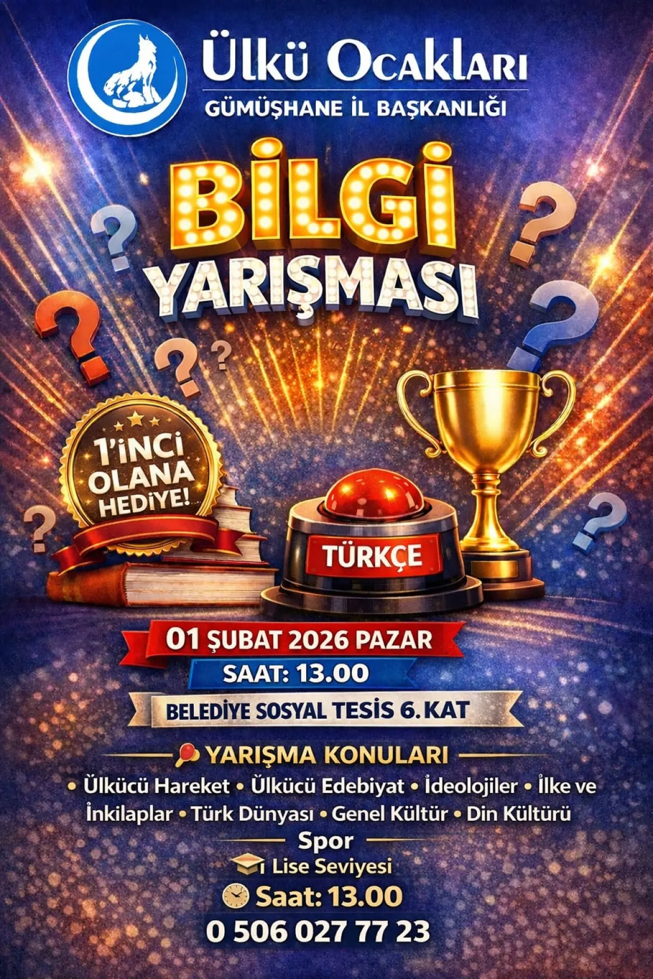 Ülkü Ocakları Gümüşhane İl Başkanlığı, Türk gençliğinin eğitim ve kültürel birikimini artırmak amacıyla kapsamlı bir bilgi yarışması organize ediyor.