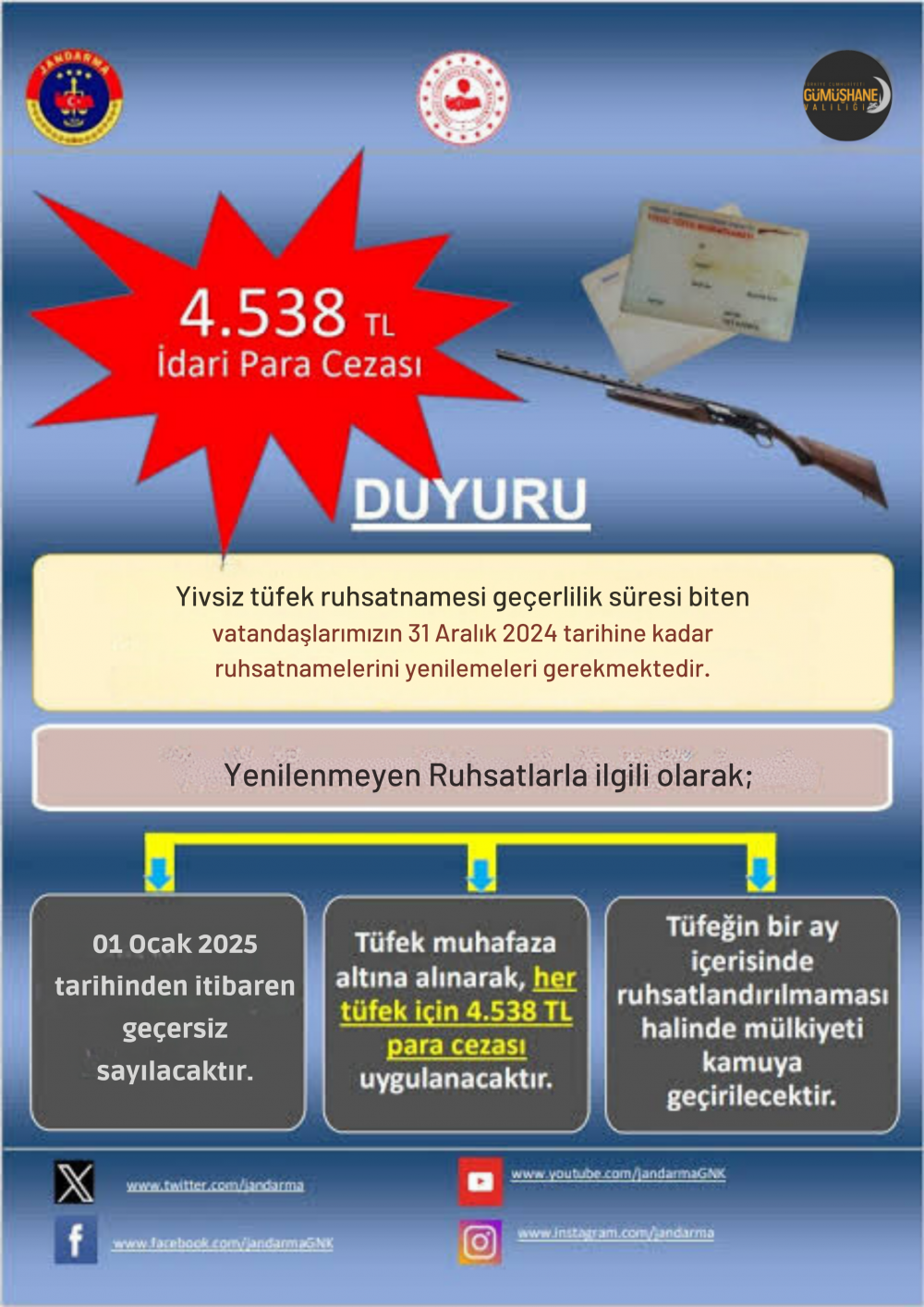 Gümüşhane İl Jandarma Komutanlığı 2521 Sayılı Kanun kapsamında yivsiz av tüfeklerinin ruhsatname yenileme işlemleri için tanınan sürenin 31 Aralık 2024 tarihinde sona erdiğini duyurdu. Bu tarihe kadar ruhsatlarını yenilemeyen tüfek sahiplerini ciddi yaptırımlar bekliyor.