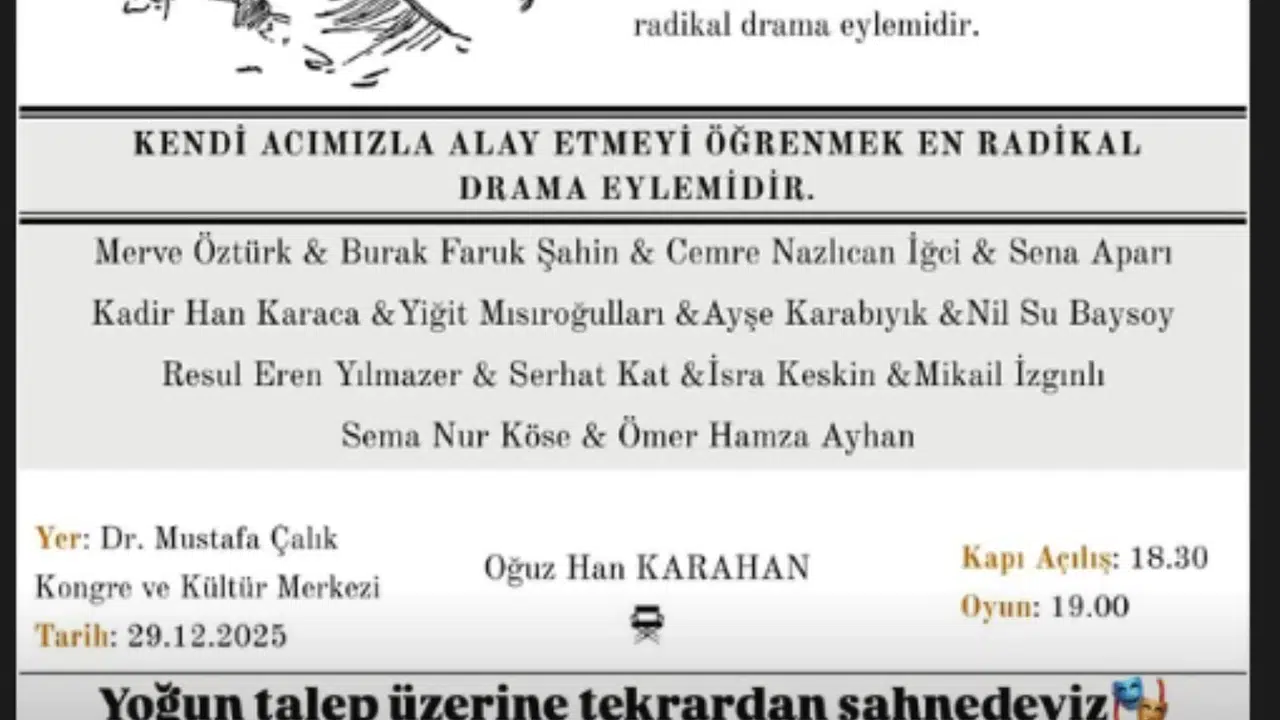 Bu eşsiz sanat deneyimine ortak olmak isteyen tüm Gümüşhaneliler ve üniversite öğrencileri için kapılar 29 Aralık 2025 tarihinde sonuna kadar açılıyor. Dr. Mustafa Çalık Kongre ve Kültür Merkezi'nde gerçekleşecek olan etkinliğin kapı açılış saati 18.30 olarak belirlenirken, perde 19.00’da açılacak.