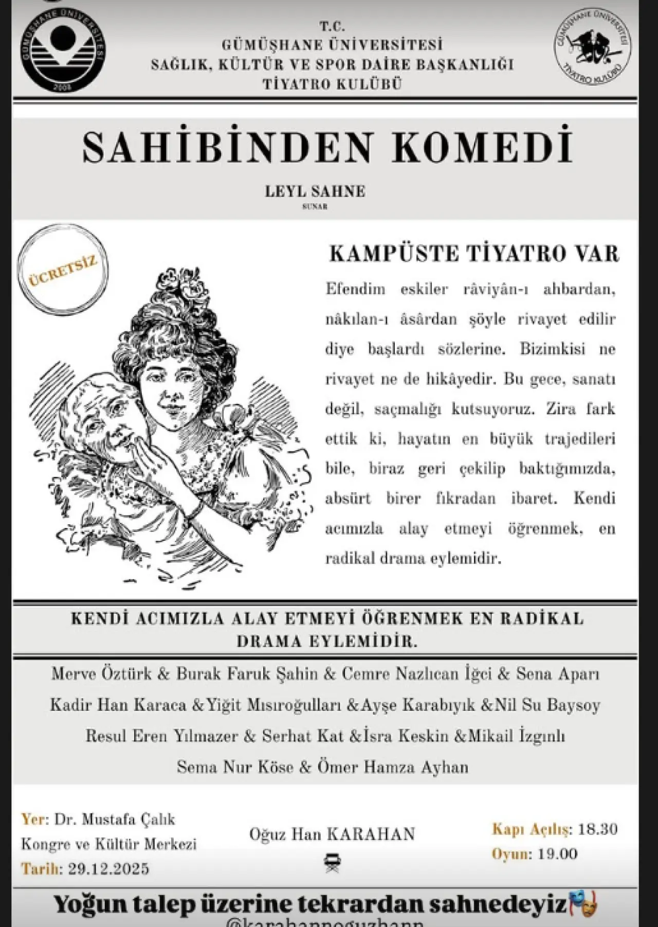Gümüşhane Üniversitesi bünyesinde sanatsal faaliyetlerini sürdüren ve her performansıyla çıtayı bir üst seviyeye taşıyan Tiyatro Kulübü, şehri yeniden kahkahaya boğmaya hazırlanıyor.