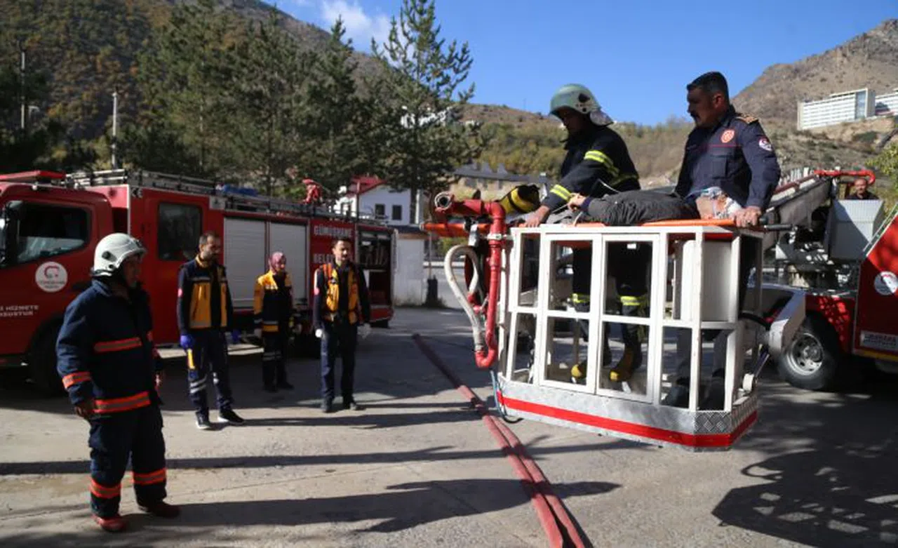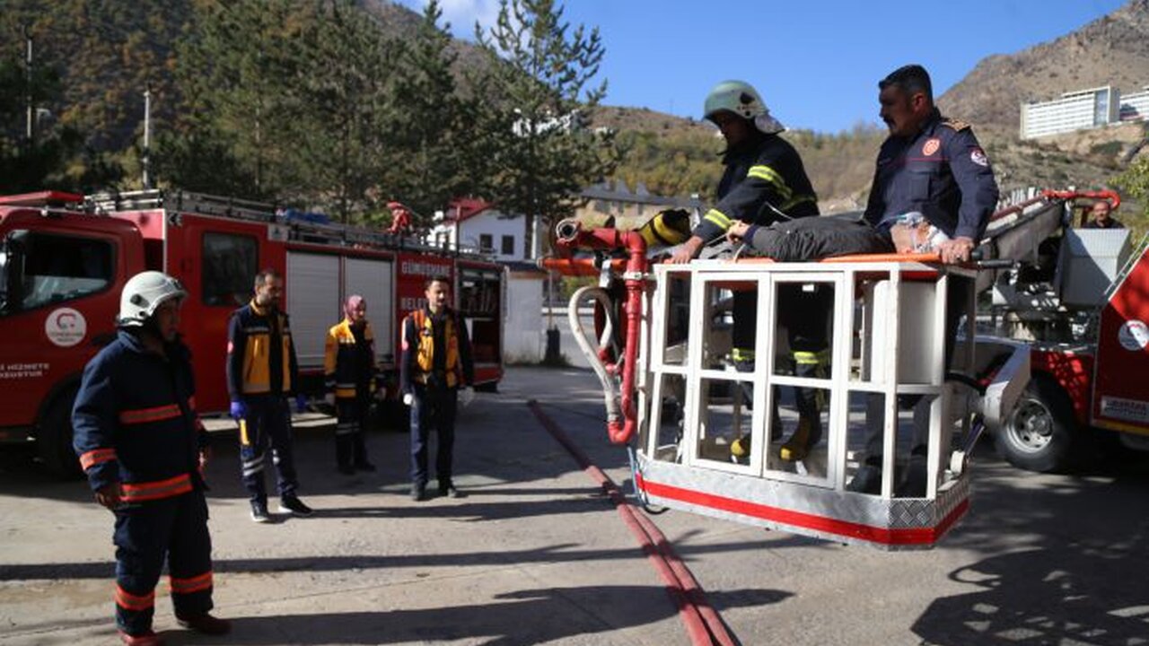 Gümüşhane İtfaiyesinin desteğiyle Bağlarbaşı Mahallesinde bulunan hizmet binasında gerçekleştirilen tatbikatta senaryo gereği çıkan yangından etkilenen ve yaralanan çalışanlar ekipler tarafından kurtarıldı.