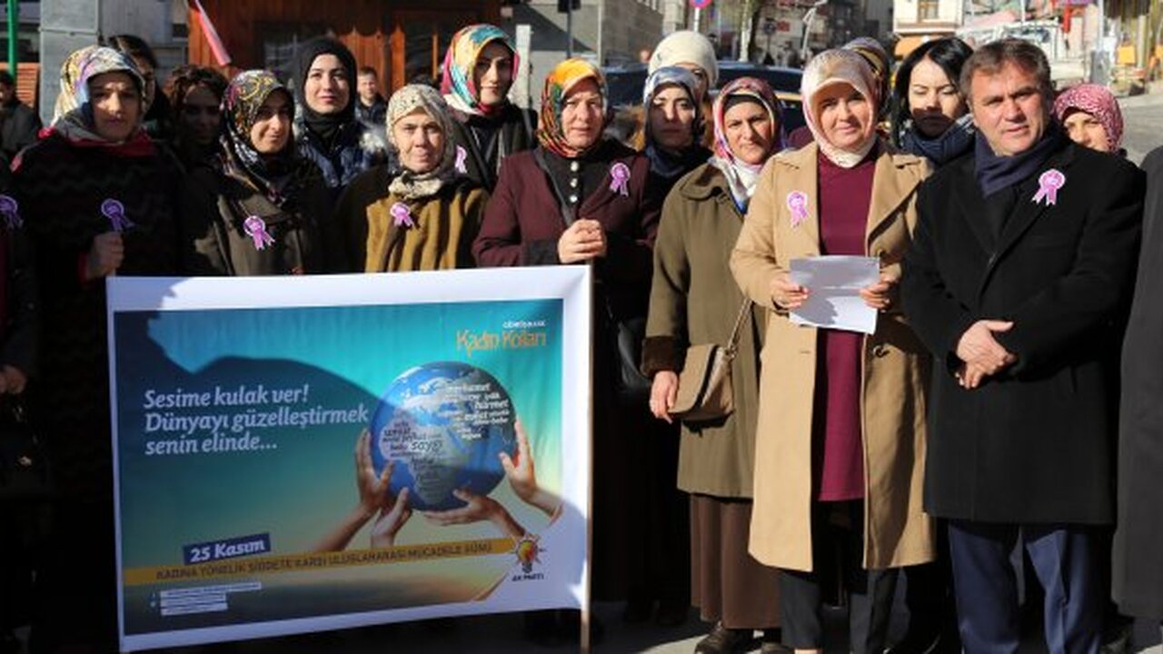 Kadınların üzerine "Sesime kulak ver! Dünyayı güzelleştirmek senin elinde" yazılı pankart taşıdığı etkinlikte konuşan AK Parti Gümüşhane Kadın Kolları İl Başkanı Şükriye Karabulut Orhan, insanlığın büyük bir kesiminin çok yönlü şiddete maruz kaldığı bir çağın kadınları olduklarını söyledi.