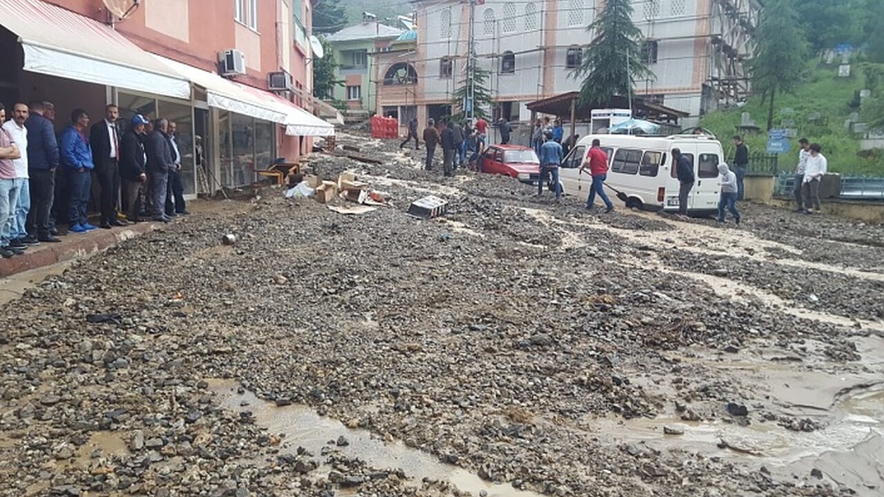 Gümüşhane’nin Torul ilçesine bağlı Altınpınar köyünde yaklaşık 2 saat etkili olan sağanak nedeniyle bir işyerini su bastı, 4 araçta sel sularının getirdiği hafriyatın altında kaldı.