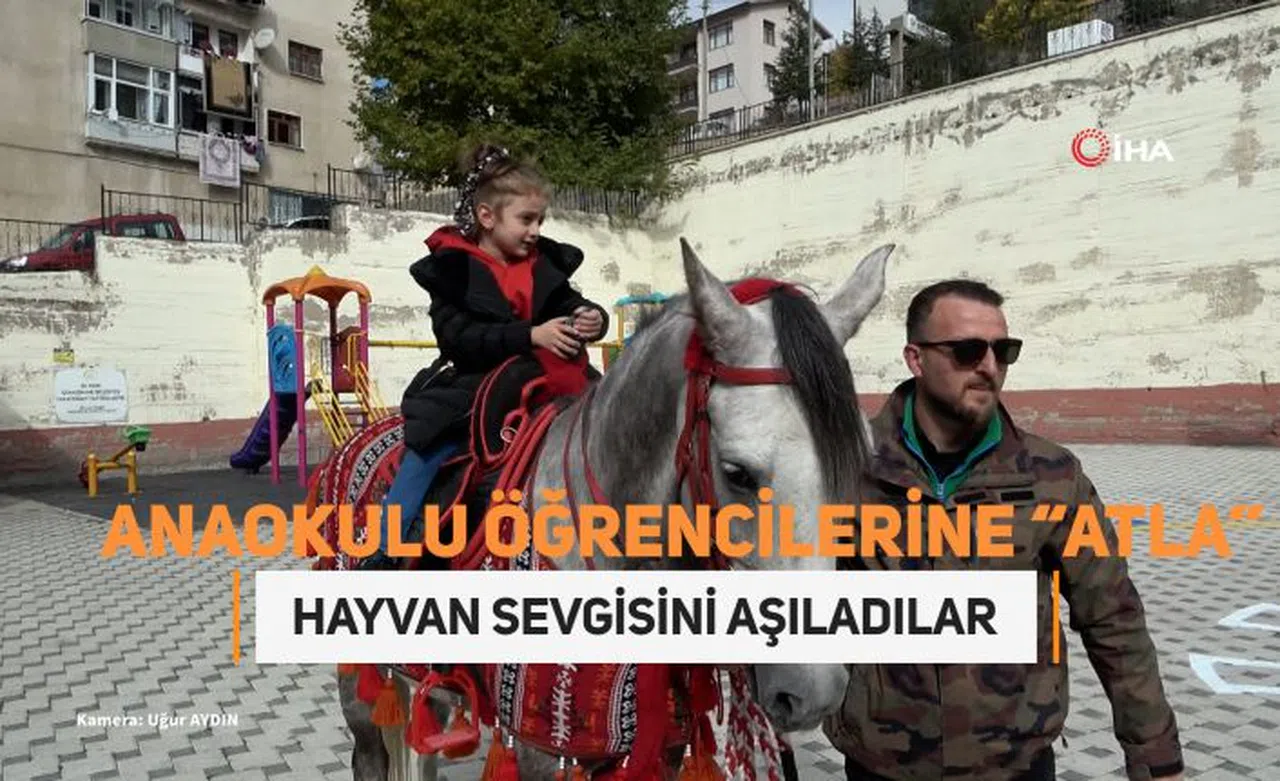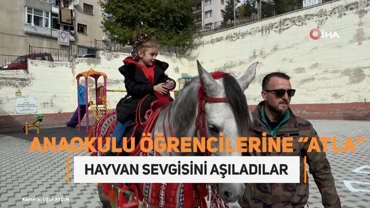 Gümüşhane’de anaokulu öğrencileri hayvan sevgisini atlarla tattı. Okul bahçesine gelen atlara binmek için birbiriyle yarışan miniklerin heyecanı renkli görüntüler oluşturdu.