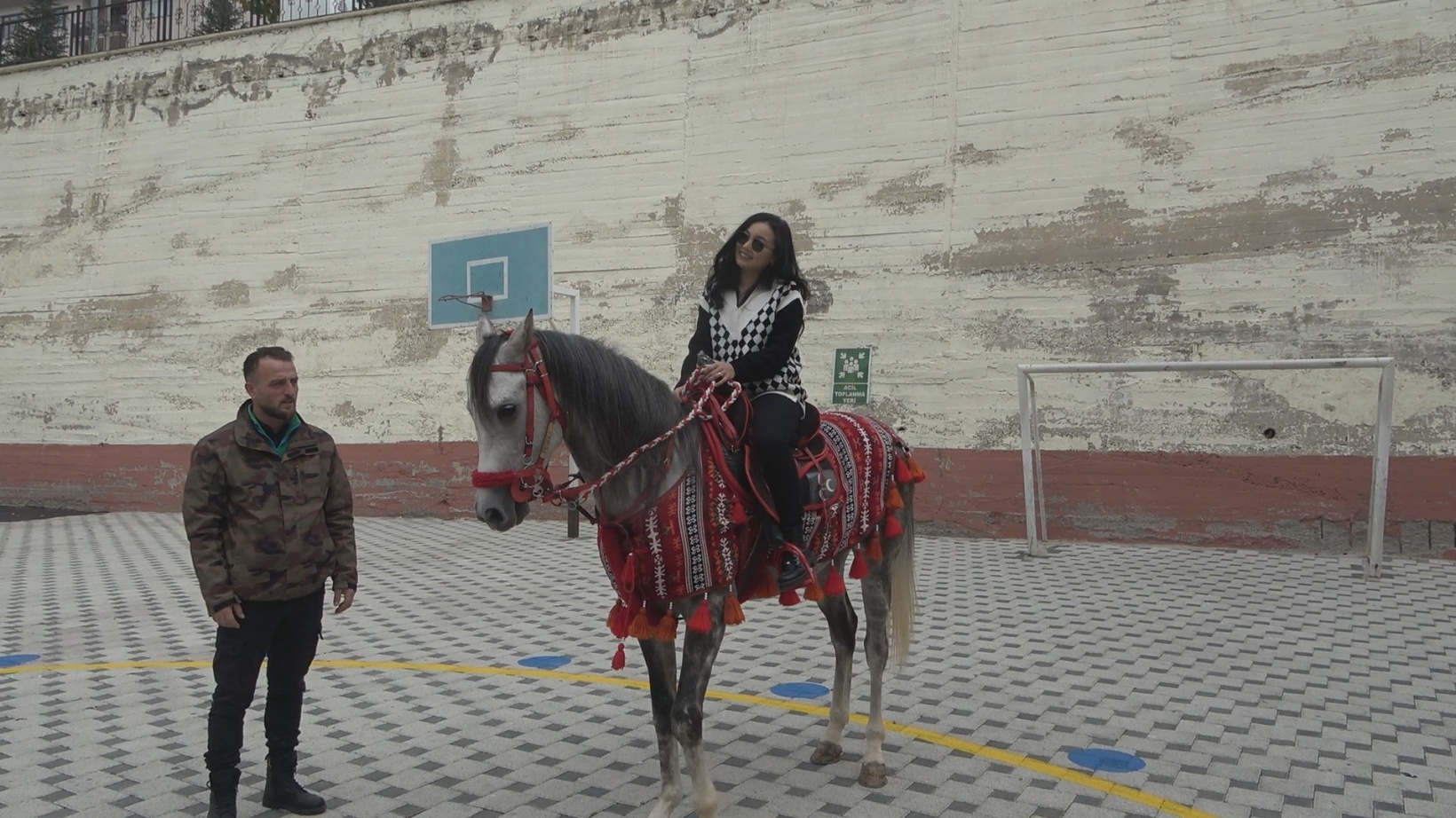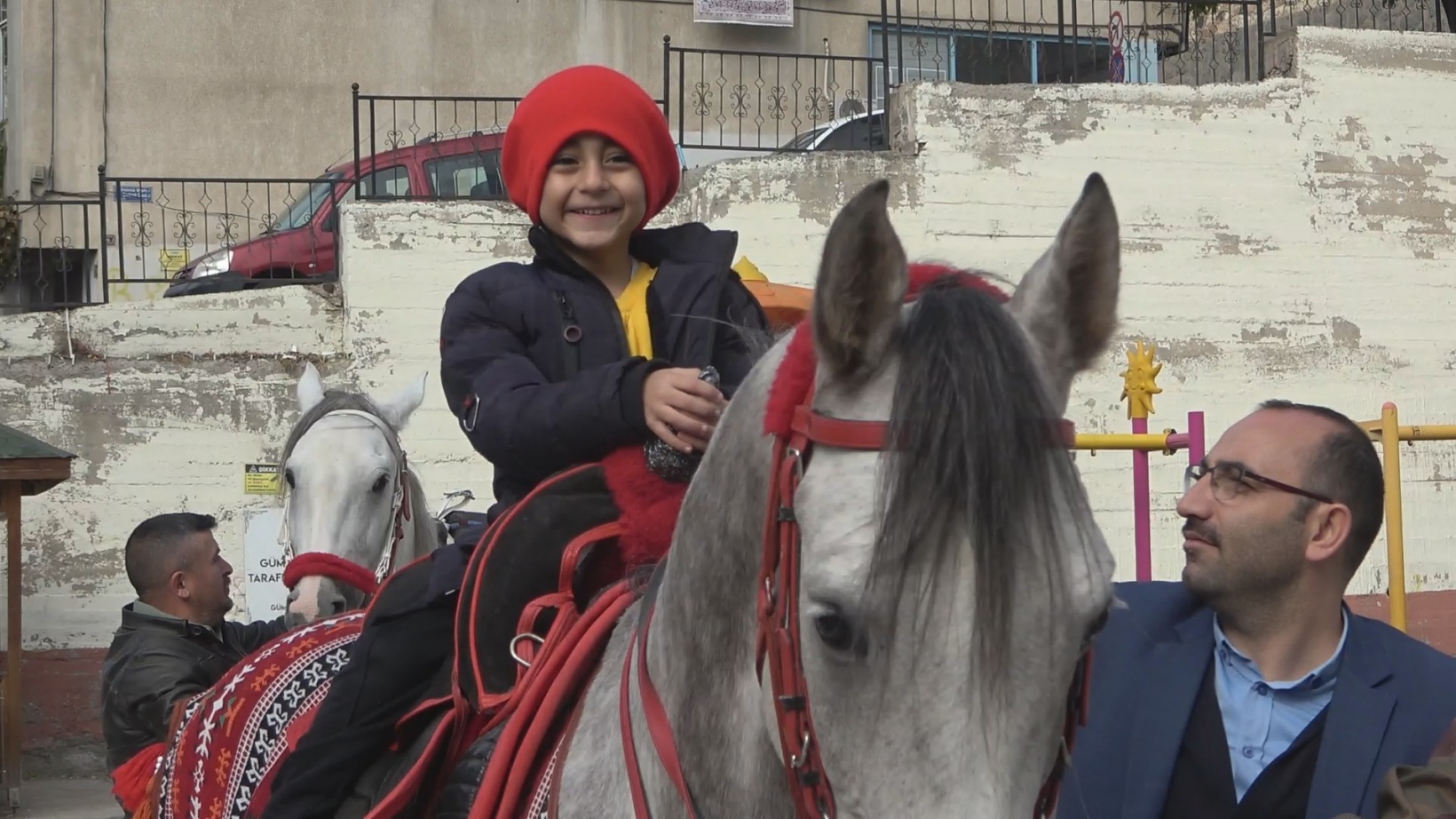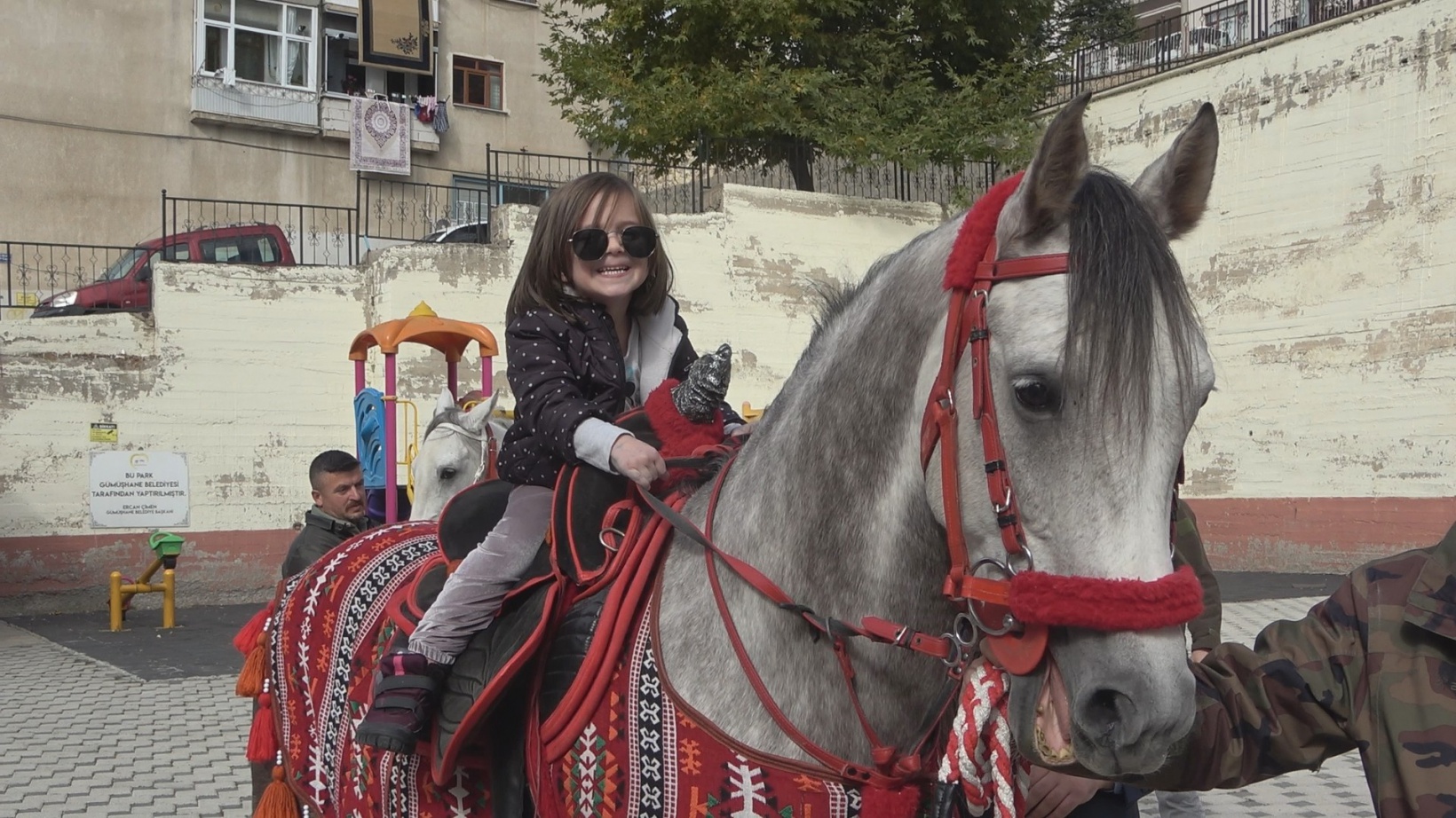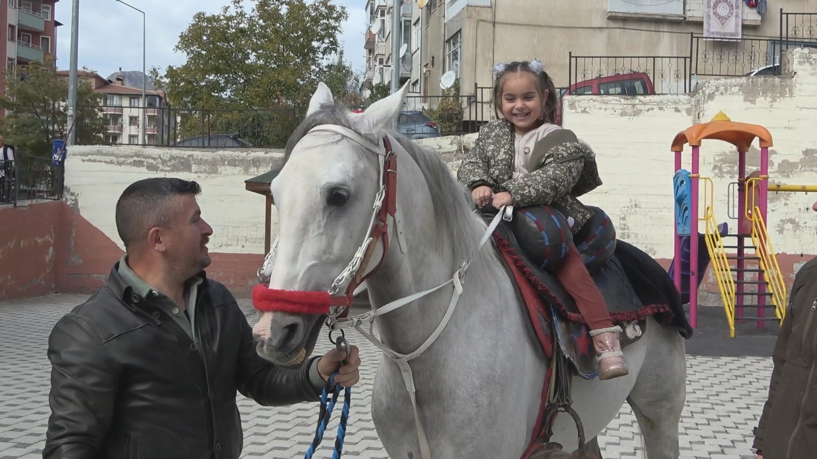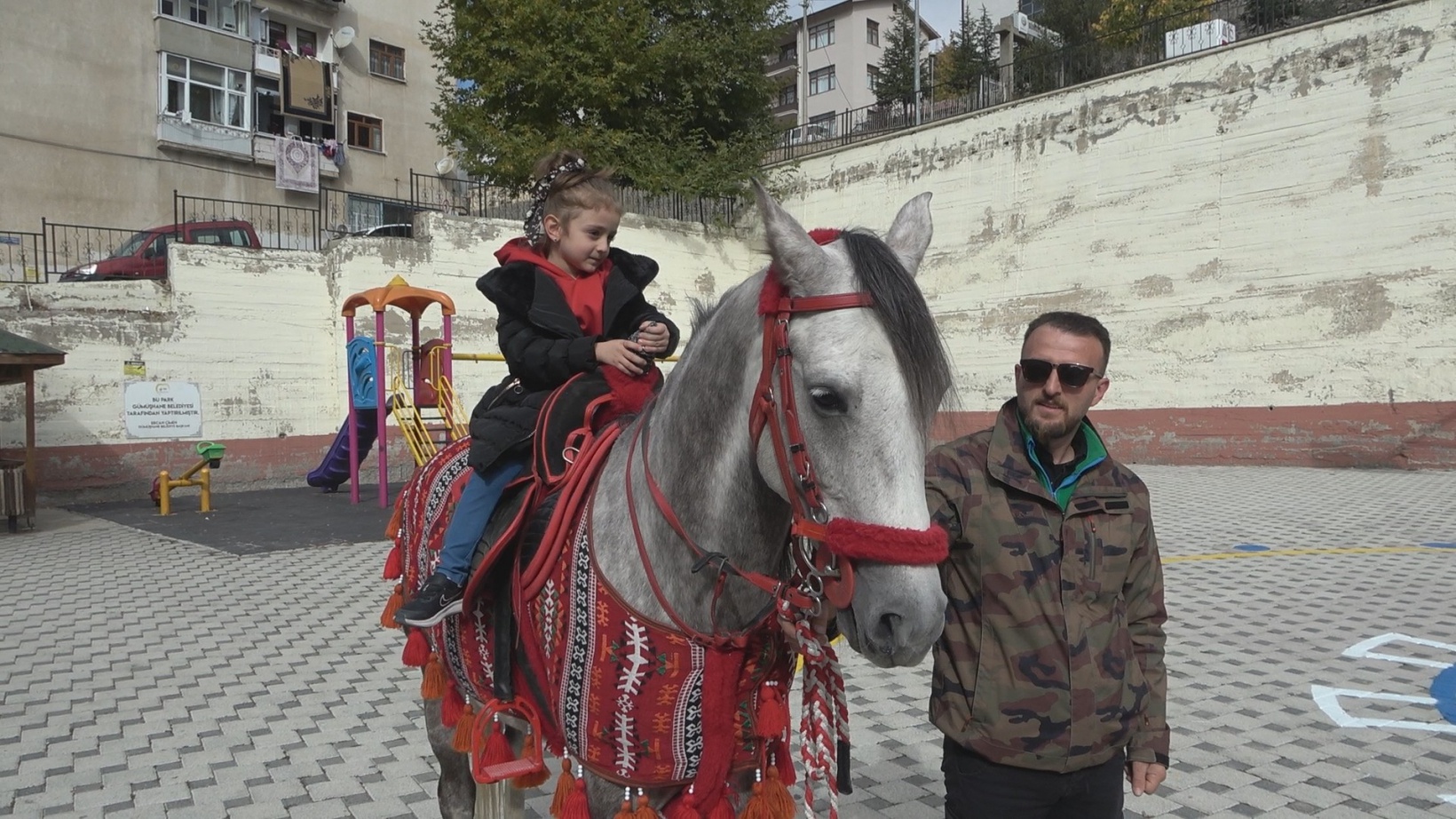 Okulun bahçesinde atları gören minikler sabırsızlıkla atlara binmeyi beklerken heyecanları izleyenlerin yüzünde tebessüm oluşturdu.