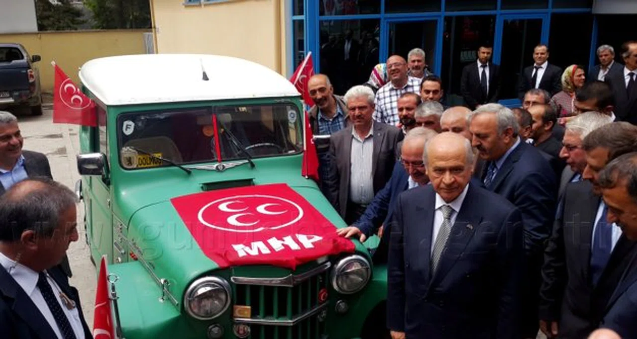 Nostaljik araçlara olan merakıyla bilinen Milliyetçi Hareket Partisi (MHP) Genel Başkanı Dr. Devlet Bahçeli’ye geceyi geçirdiği Gümüşhane’de kaldığı otelin bahçesinde bulunan 1952 model Willys Wagon jip hediye edildi.