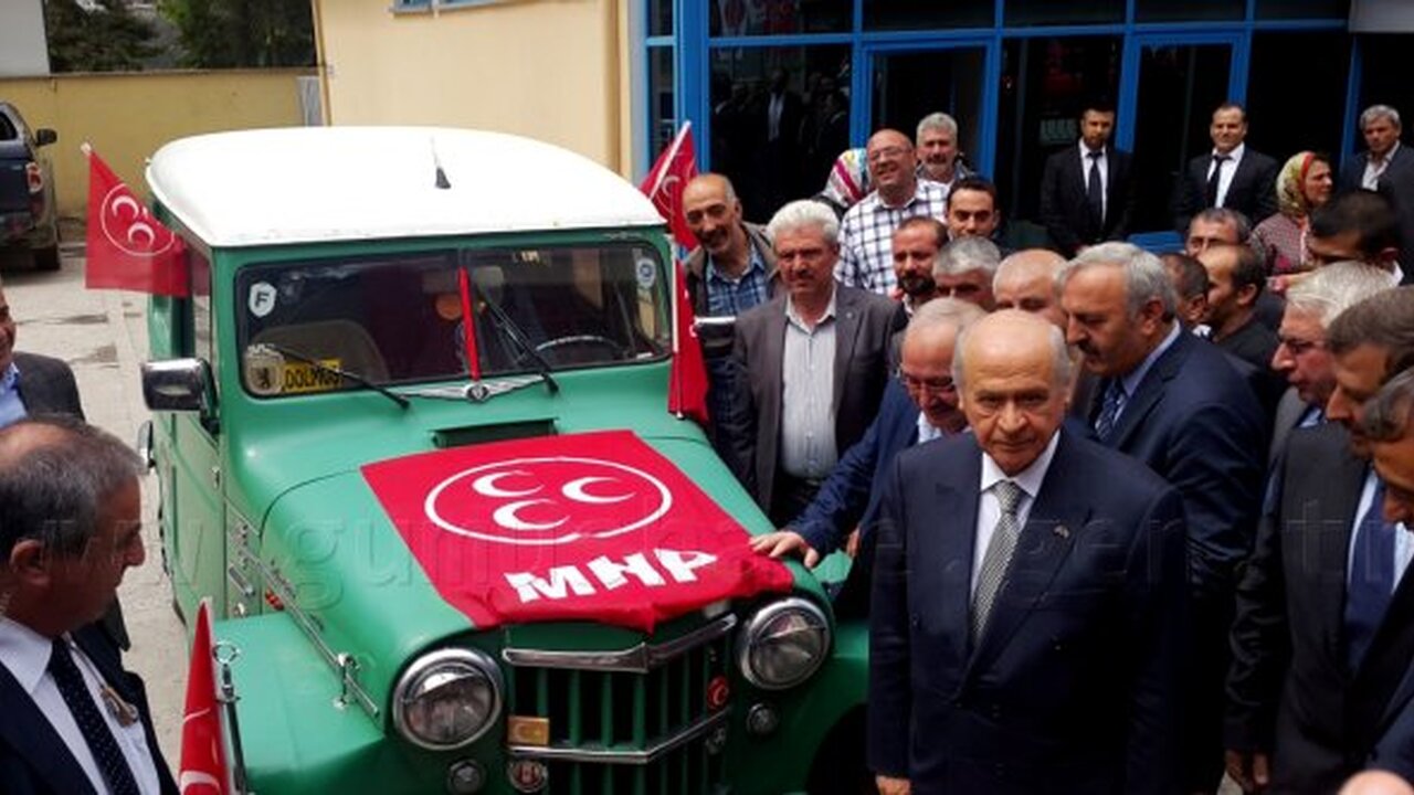 Dünkü Gümüşhane Mitingi sonrasında geceyi Gümüşhane'de bir otelde geçiren Bahçeli, bugün kaldığı otelde partisi tarafından sivil toplum örgütleri ve teşkilat mensuplarıyla düzenlenen kahvaltıya katıldı. Kahvaltı sonrasında Bahçeli'ye bir süpriz yapıldı. Nostaljik araçlara olan merakıyla bilinen MHP liderine otelin bahçesinde bulunan Mehmet Kızılet’e (58) ait 1952 model Willys Wagon marka jip gösterildi.