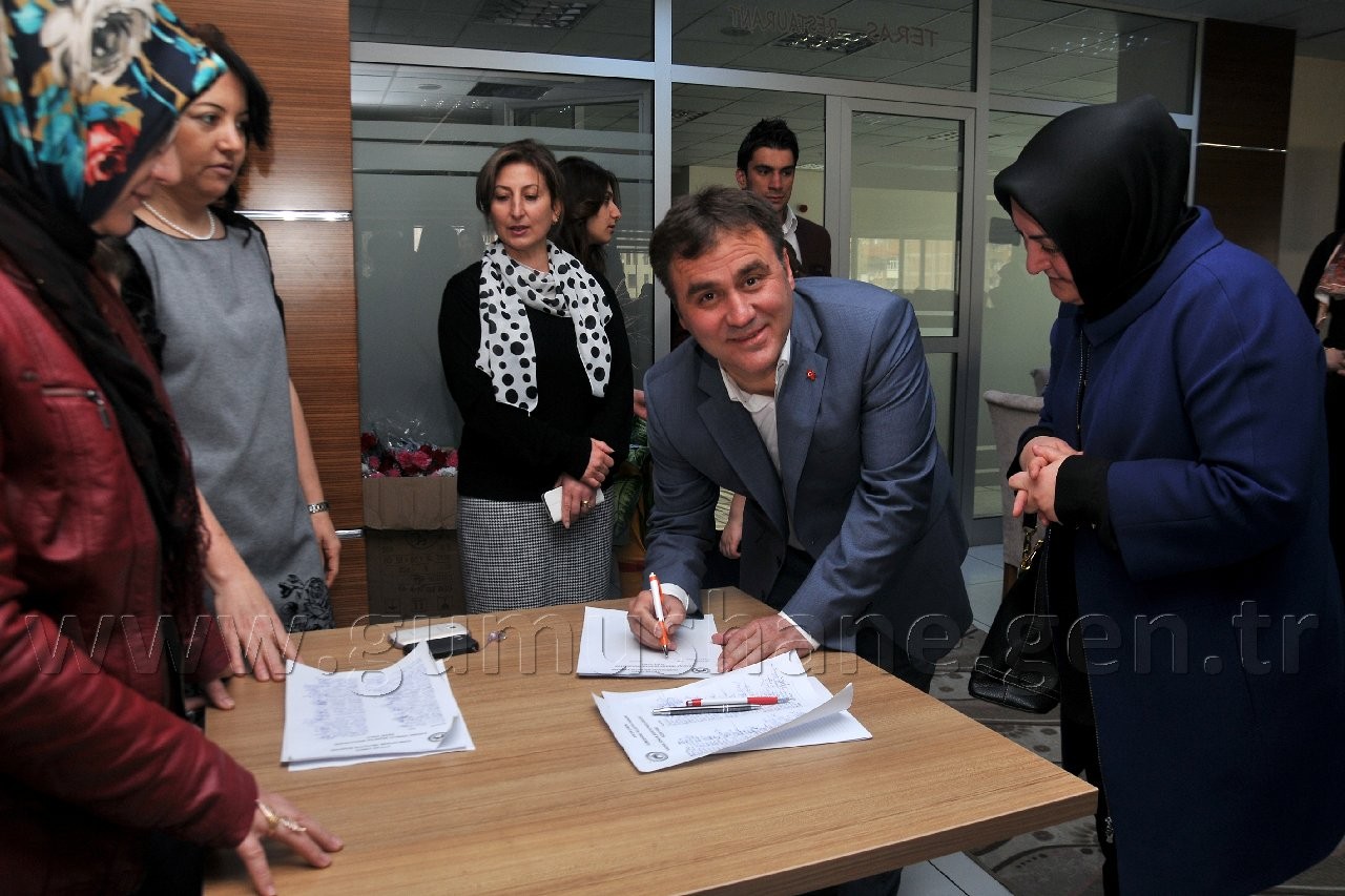 Belediye tarafından başlatılan “Kadına Karşı Şiddete Hayır” kampanyasına imza atan Başkan Çimen, etkinliğe katılanların masalarını eşi Gülsen Çimen ile tek tek gezerek, burada katılımcılara karanfil ve hediye verdi.