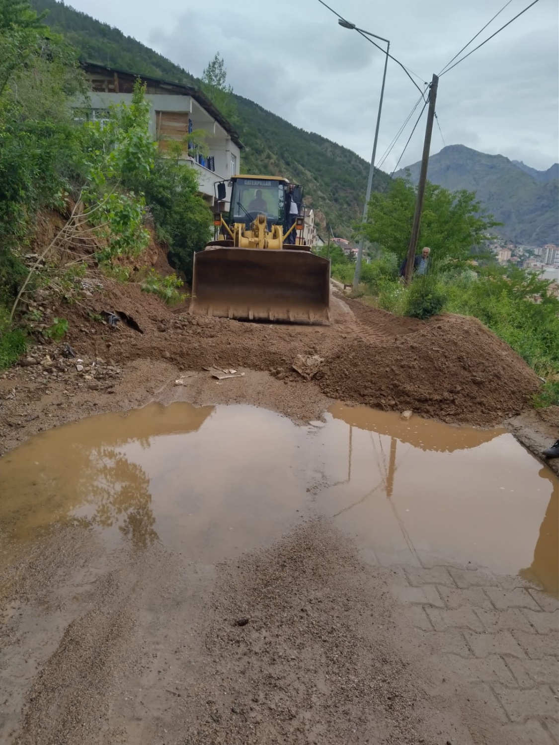 Gümüşhane Belediyesi ekipleri kentte etkili olan kuvvetli yağış sonrası yollarda ve mahalle aralarında oluşan çamurları ve taş toprak yığınlarını temizledi.