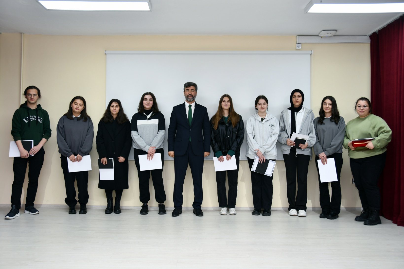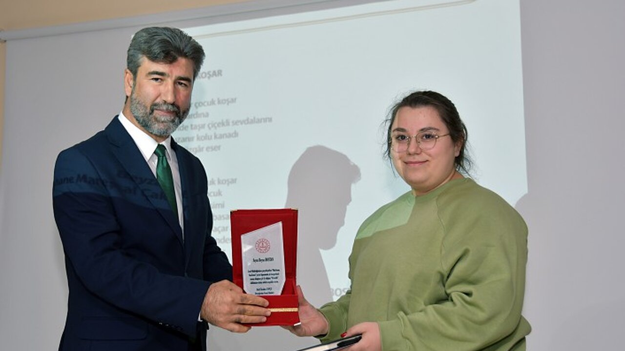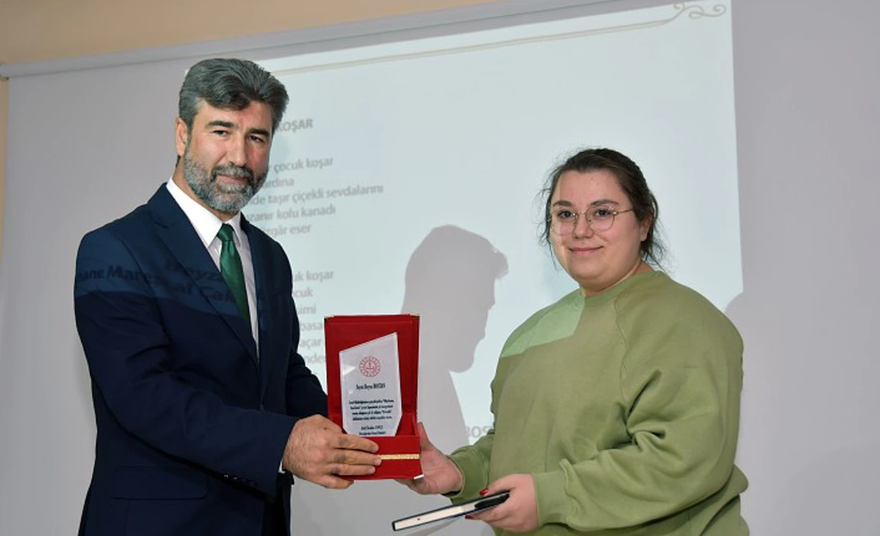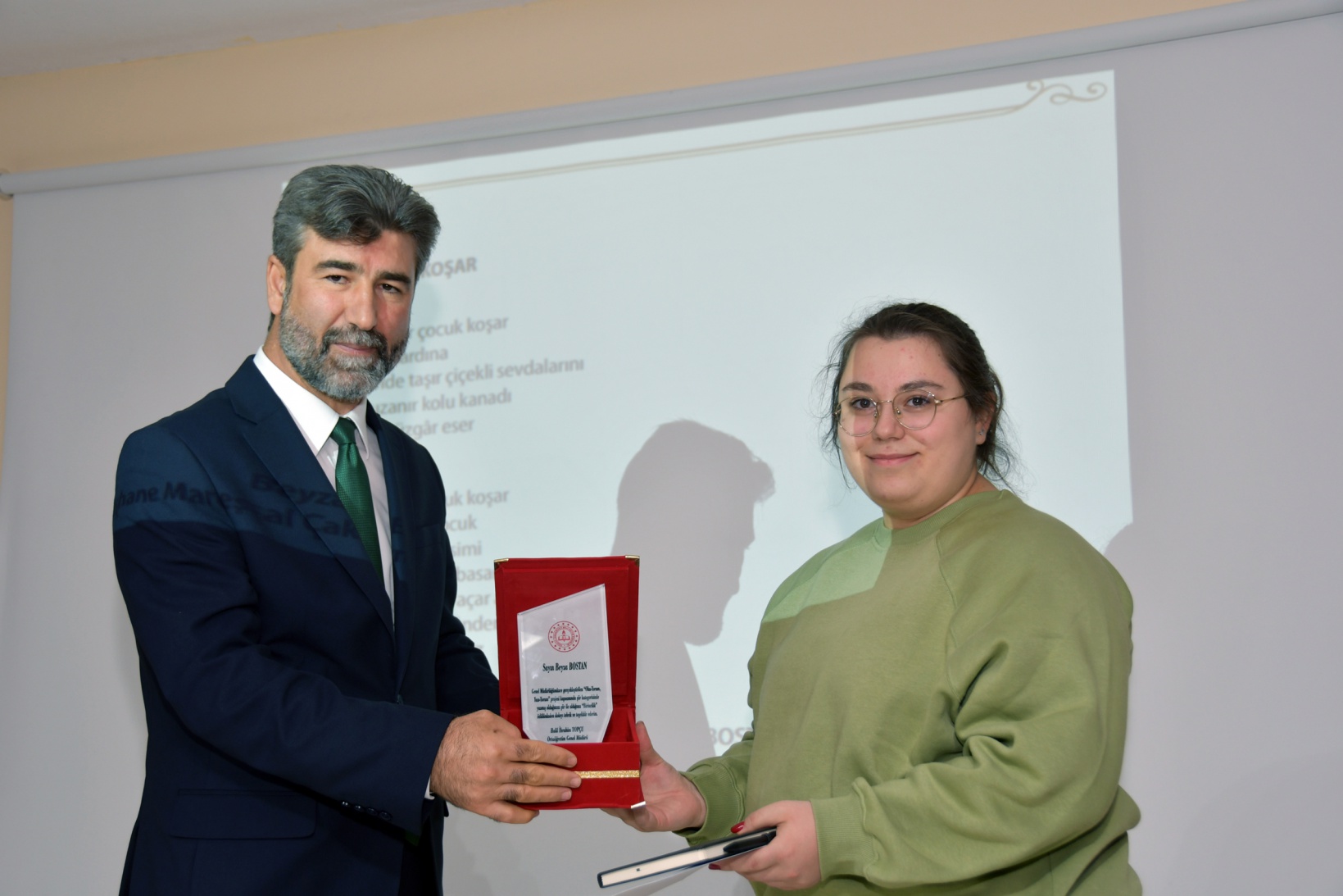 Ekim 2022’den beri yürütülen proje sonunda düzenlenen şiir yarışmasında Türkiye birincisi olan Beyza Bostan’a, projede görev alan öğrenci ve öğretmenlere belgelerinin verilmesi ve yeni dönem projenin tanıtılması amacıyla Mareşal Çakmak Sosyal Bilimler Lisesi konferans salonunda program düzenlendi.