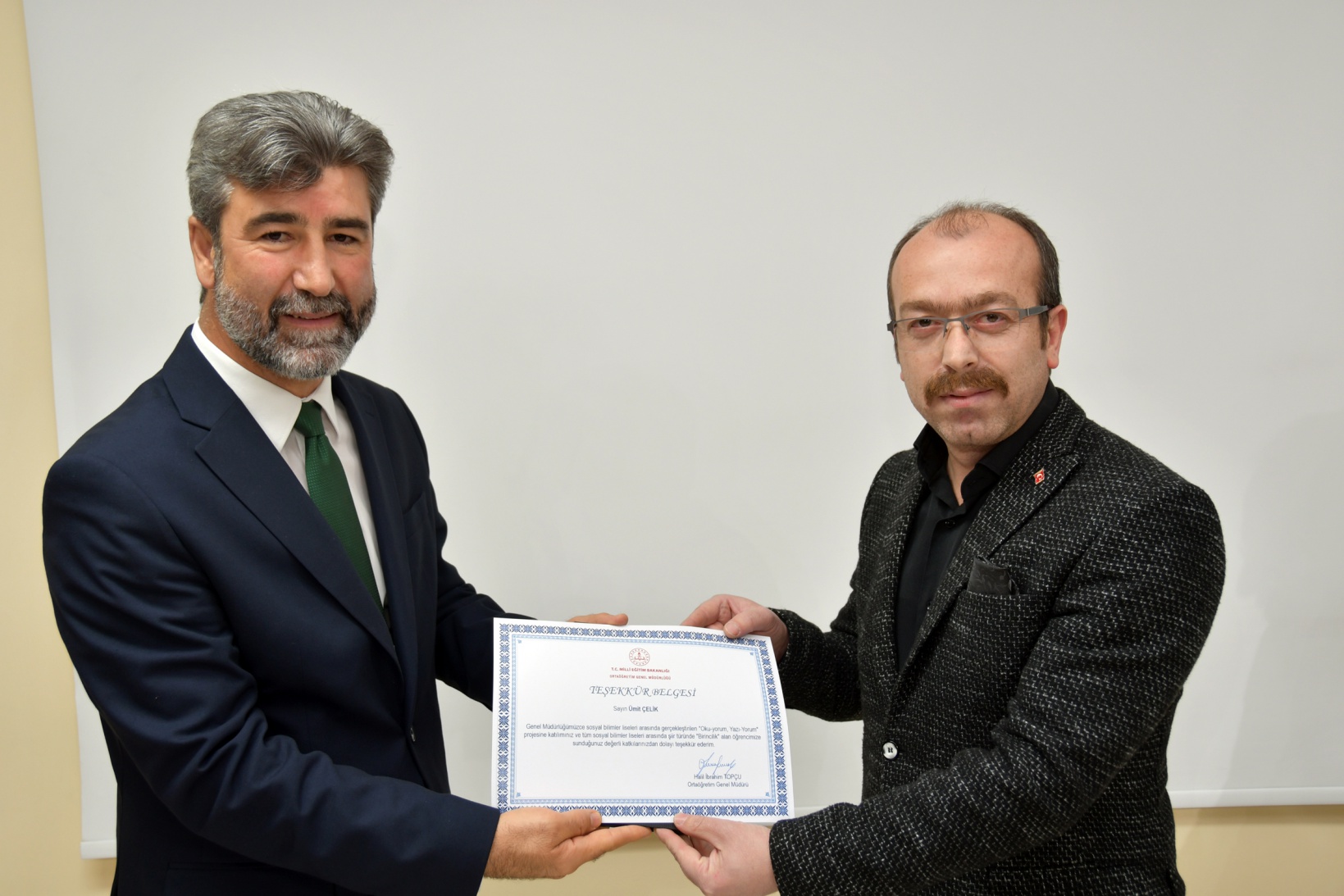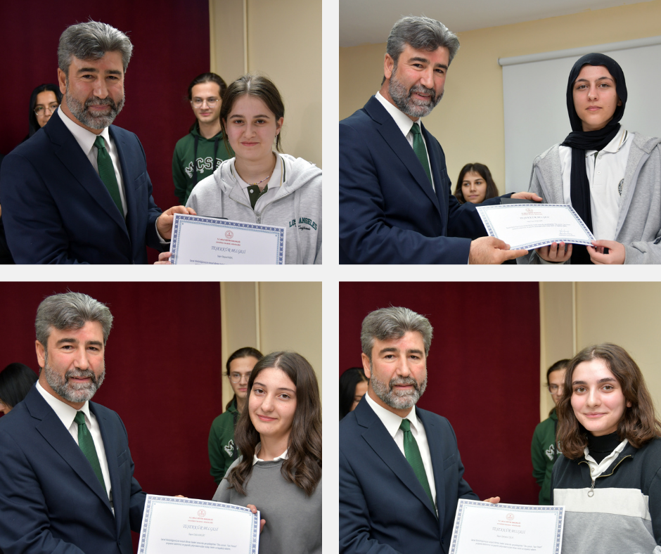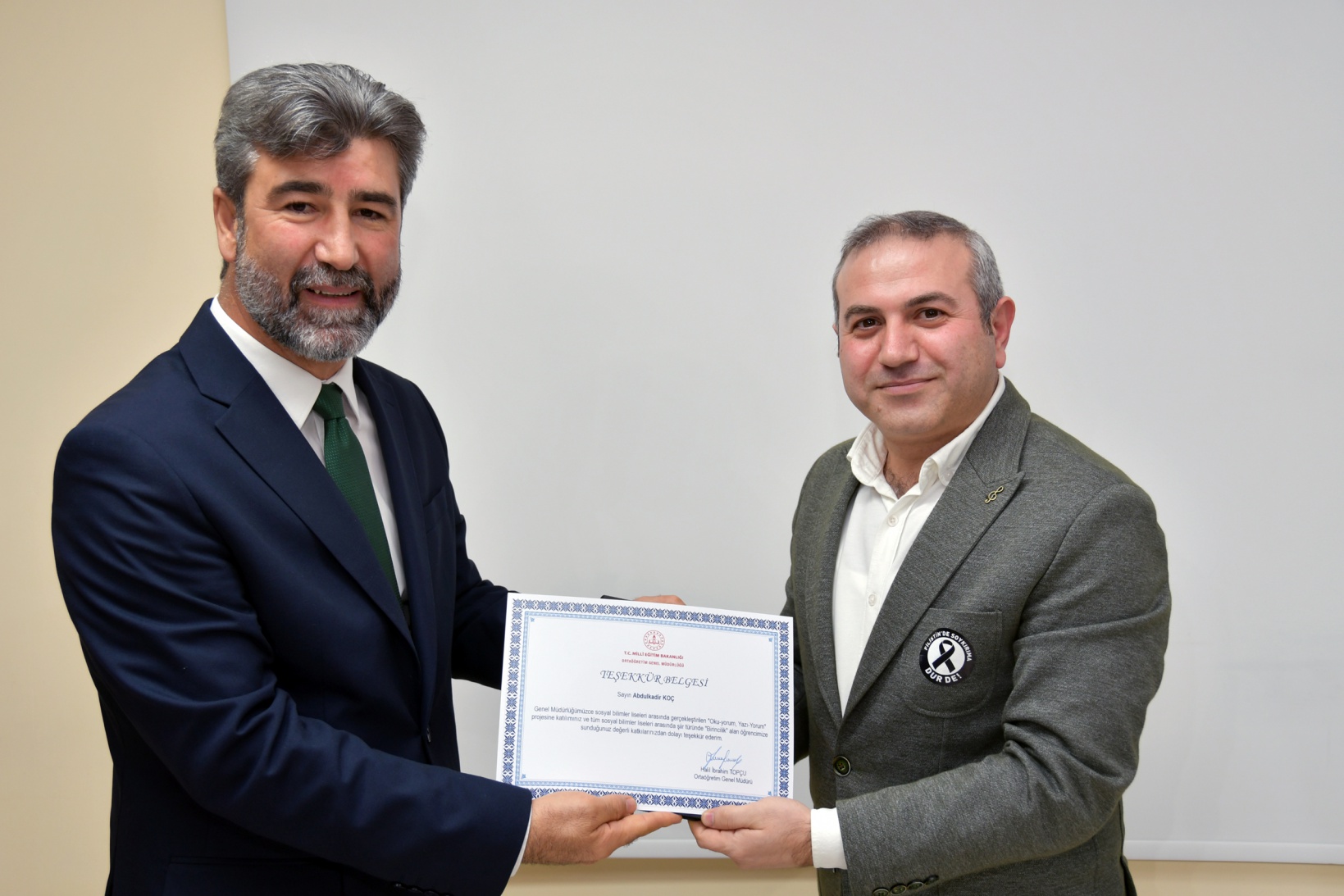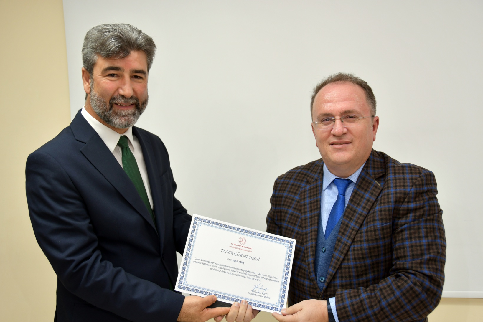 Konuşmaların ardından İl Milli Eğitim Müdürü Adnan Gürbüz, proje danışman öğretmenleri Abdulkadir Koç ve Ümit Çelik’e, Okul Müdürü Hamit Tanış’a ve projeye katılım sağlayan öğrencilere Ortaöğretim Genel Müdürlüğünün gönderdiği teşekkür belgeleri ve hediyelerini takdim etti.