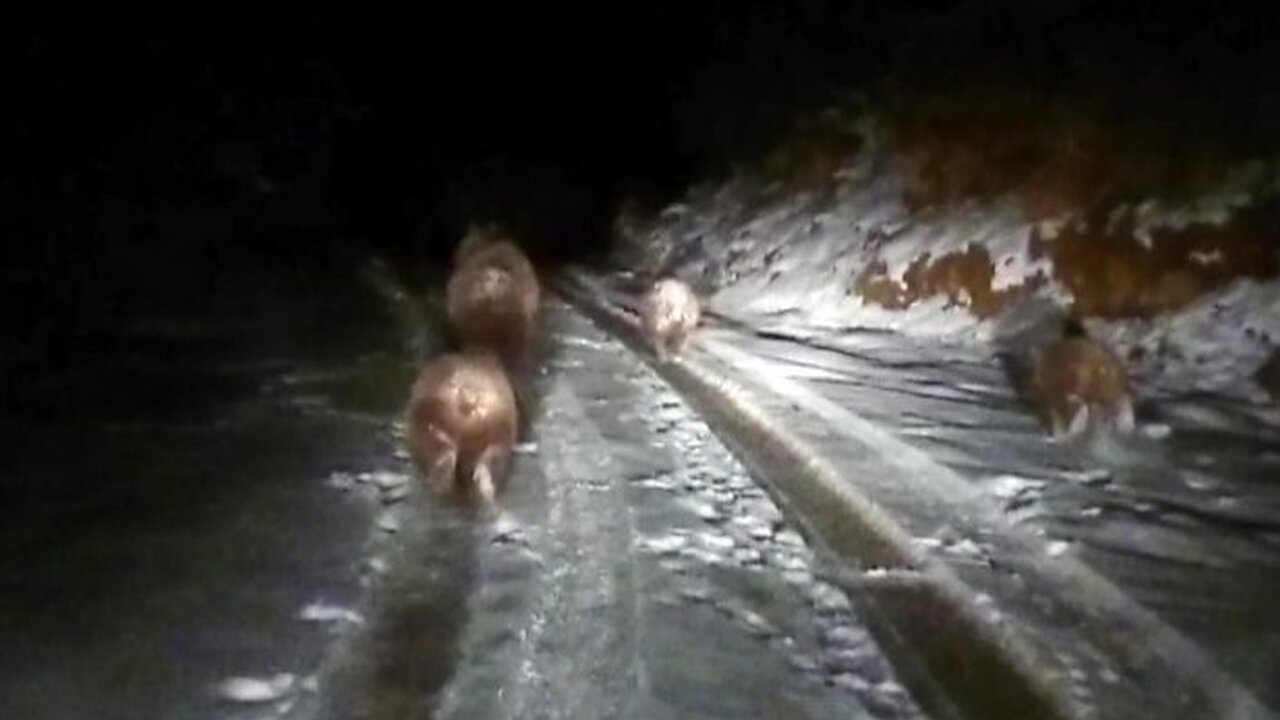 Gümüşhane’nin Torul ilçesinde kış uykusuna yatmayan ayılar vatandaşların yoluna çıktı. 3 yavrusuyla kaçan anne ayının yavrularını korumak için aracın üzerine doğru yaptığı hamle kameralara yansıdı.
