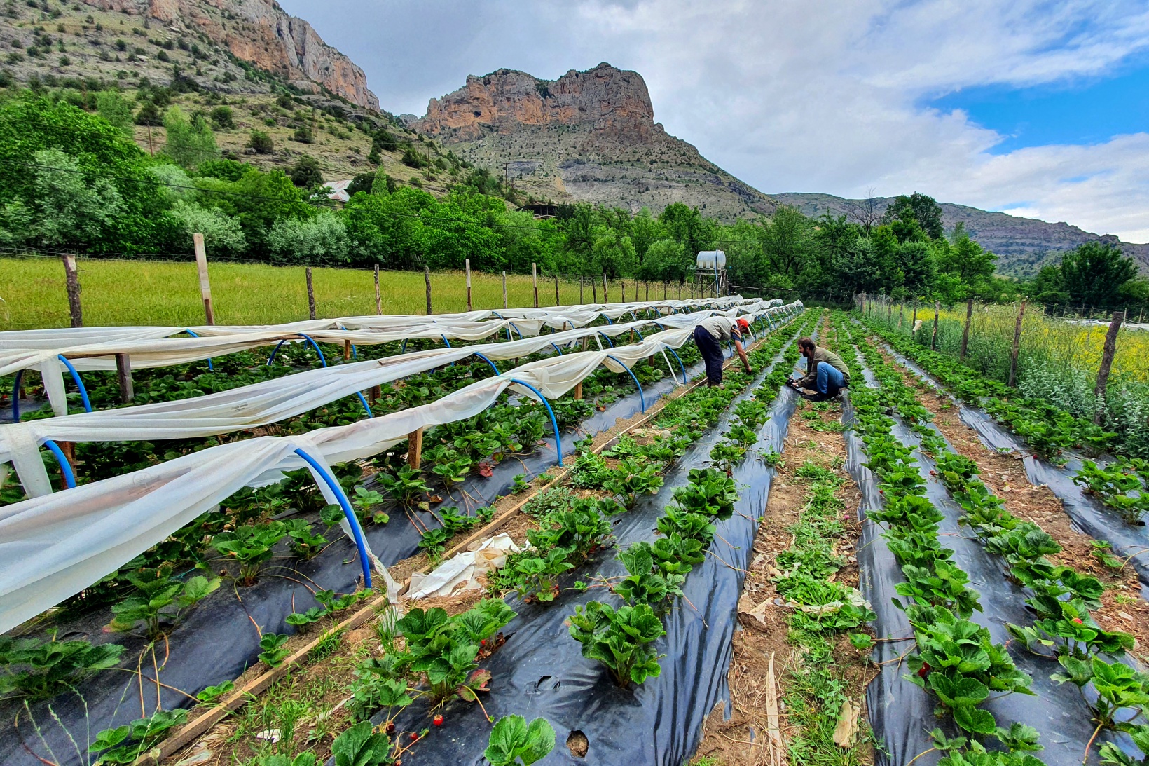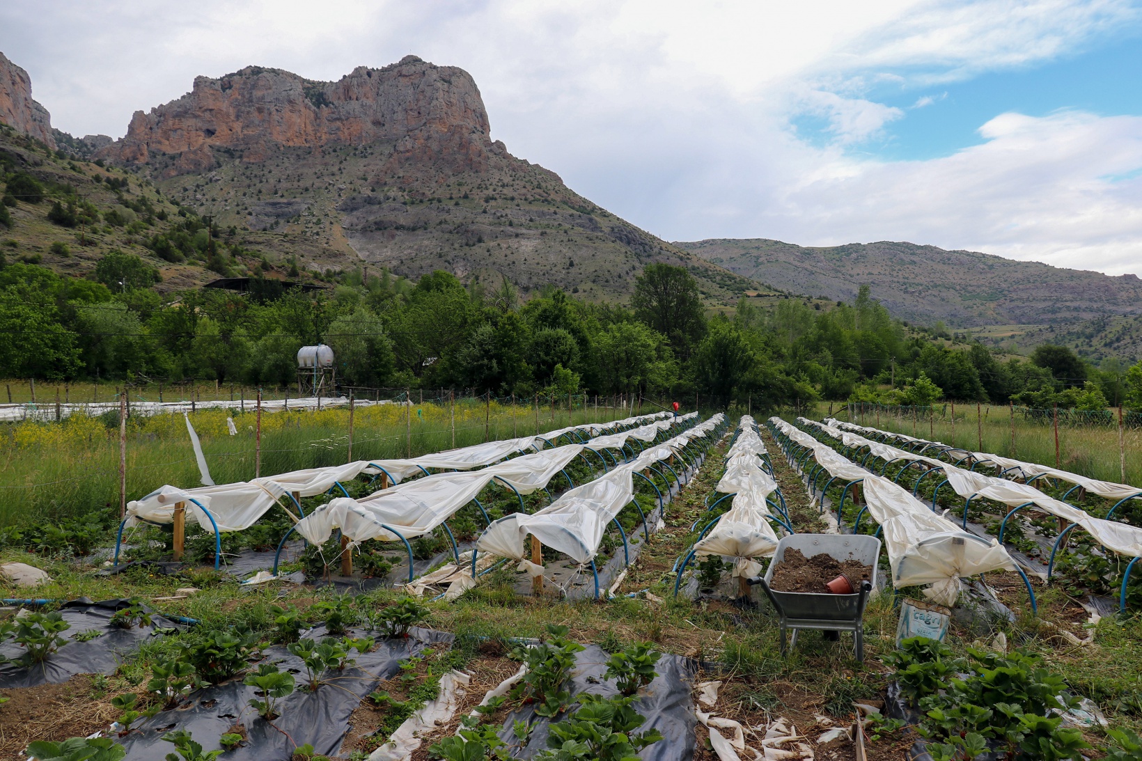 Gümüşhane’de denizden bin 432 metre yüksekte çilek yetiştiren ve yoğun ilgi nedeniyle taleplere yetişemeyen üretici haftanın 7 günü çileklere türkü dinletiyor.