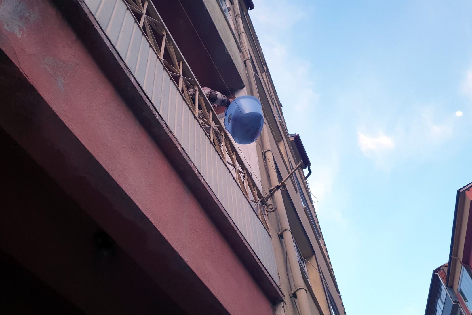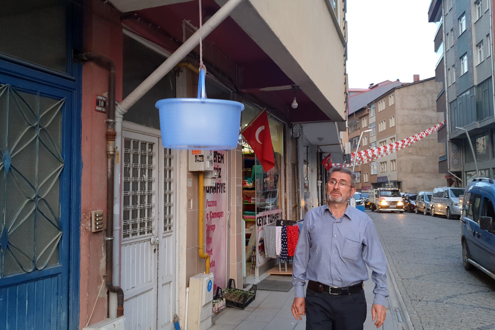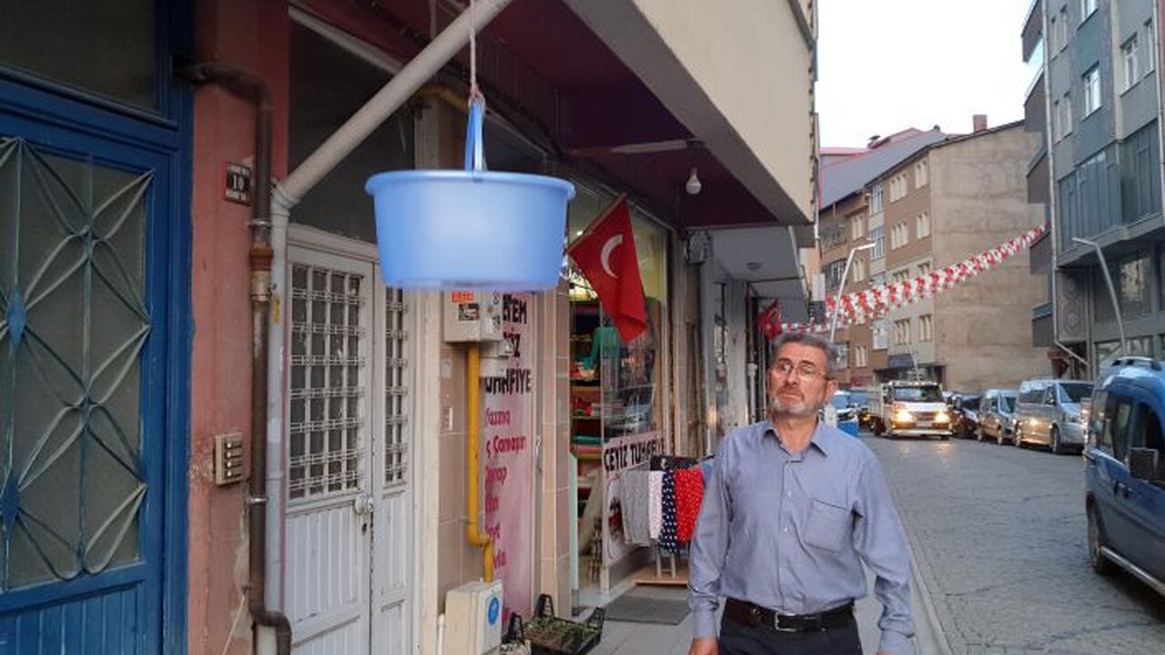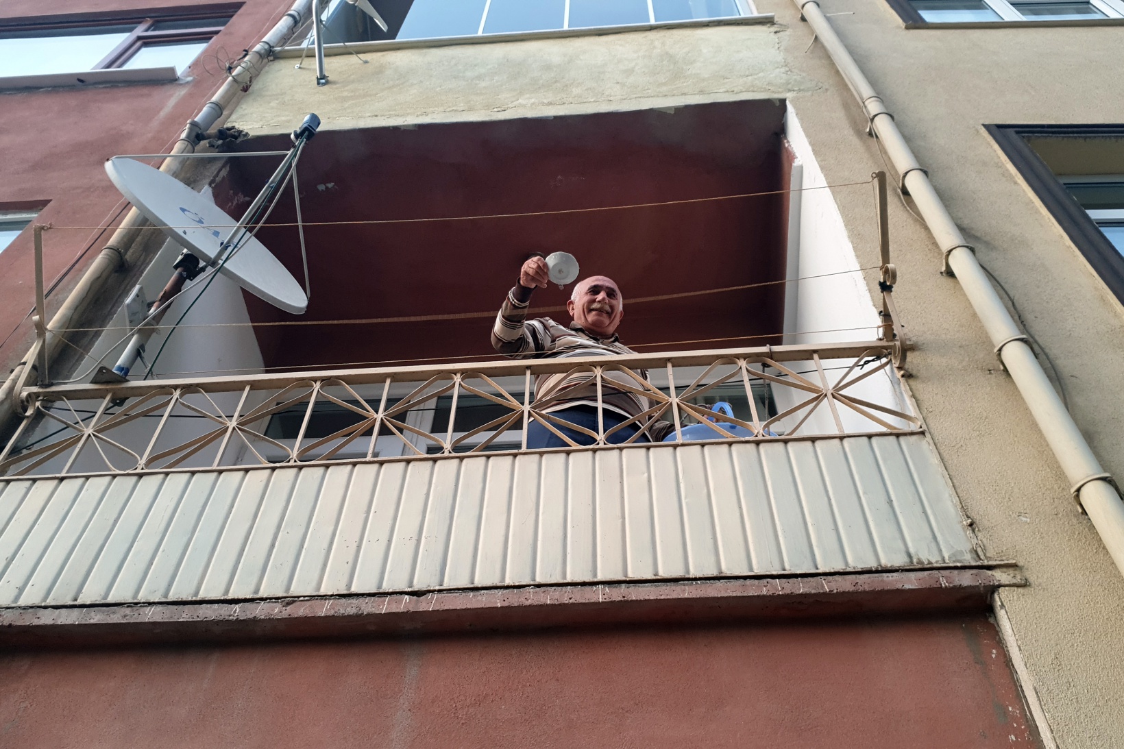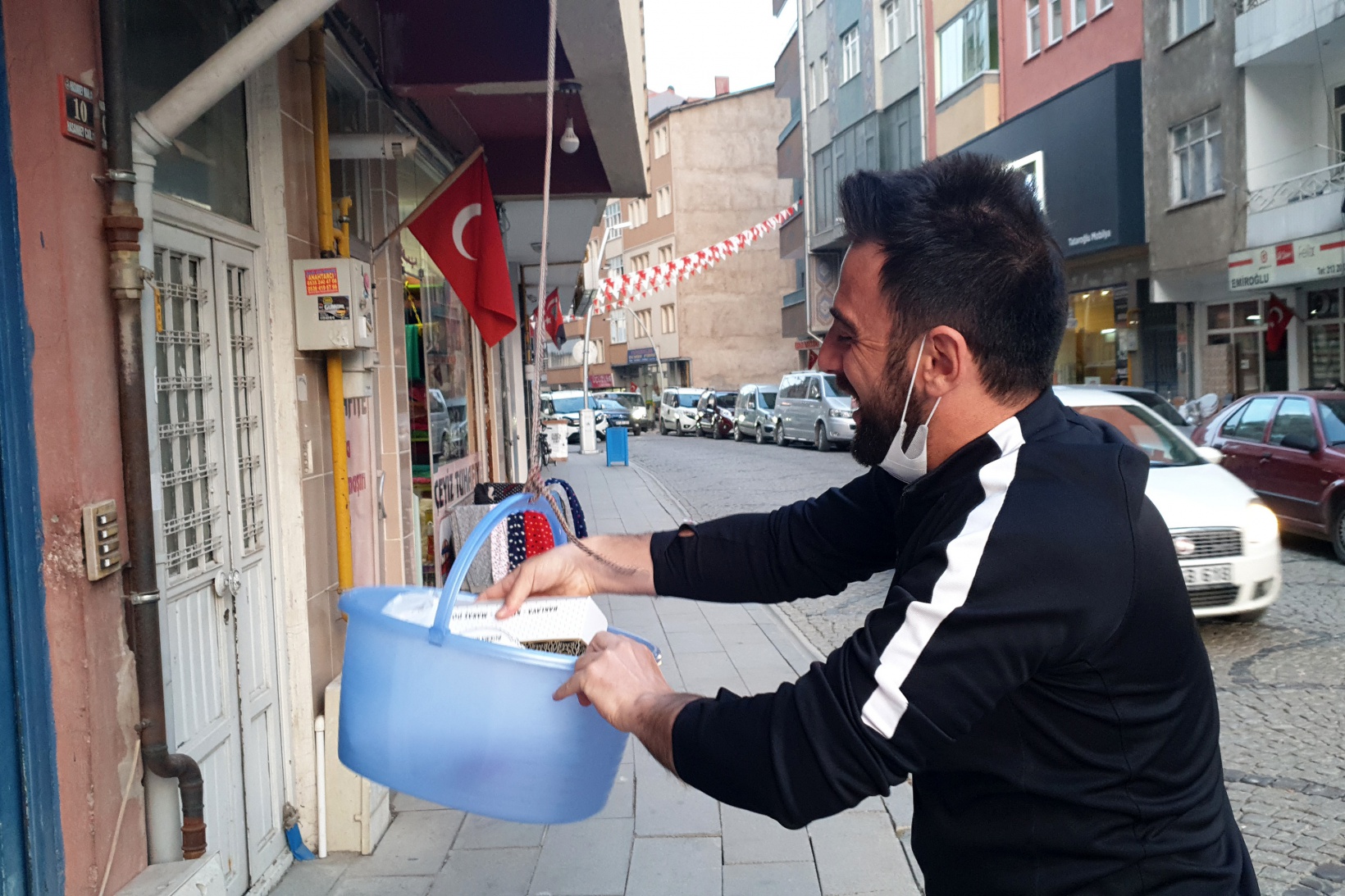 65 yaş ve üzerine uygulanan sokağa çıkma kısıtlaması nedeniyle çay ocağının önünde oturan vatandaşları görünce balkondan çay siparişi veren Yalçın’a çayını götüren Akçay, iple sarkıttığı sepete koyduğu sıcak çayını gönderdi ve boş bardağı da yine aynı şekilde aldı.