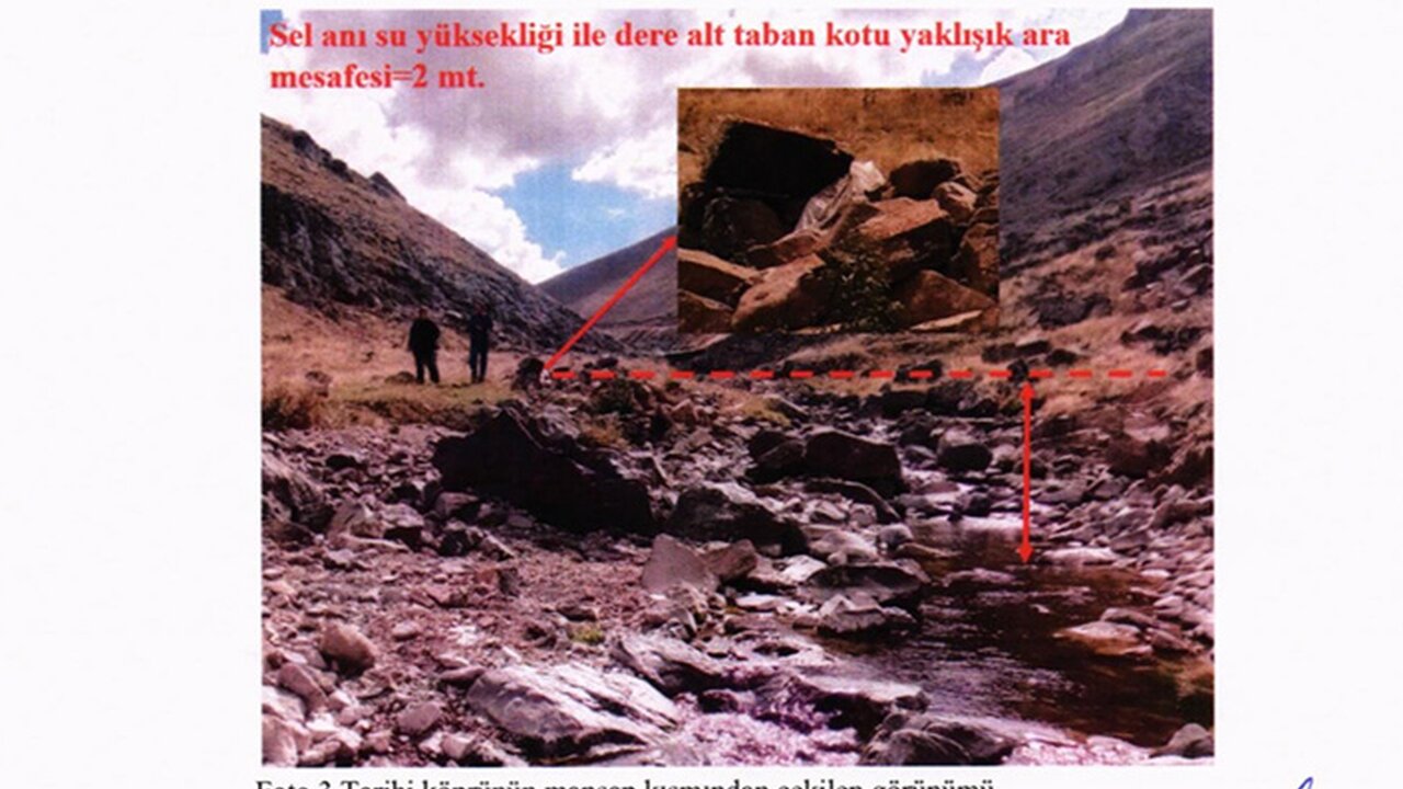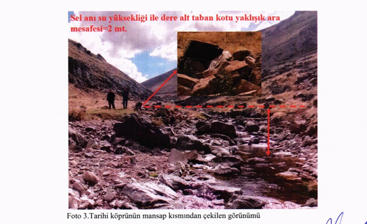 “Mahallinde yapılan teknik inceleme neticesinde tarihi köprünün sağ ve sol ayak kalıntıları gözlemlenmiş ve köprünün ayaklarının yerli moloz taşlarla yapıldığı tespit edilmiştir. Köprünün sol ayağı kayalık zemin üzerine yerleştirilmiş olup sağ ayağı ise ham toprak üzerine temel örülerek yerleştirilmiştir. Yapılan incelemelerde arazideki emarelere göre su seviyesinin en derin noktada 2 metre  civarı yükselerek dere akış yönü ile sağ sahilde 3,5 metre, sol sahilde 1,5 metre yanal genişleme gözlemlenmiştir. Bu bilgiler ışığında taş köprünün taşıyabileceği debi miktarı l0 m3/sn artış  göstererek ilk olarak su akış yönünde köprünün sol ayak kısmına etki ederek taşıyıcı sistemin dengesinin bozulmasına neden olmuş ve kemer köprü çökmüştür. Kemer köprünün tamamen çökmesinde horasan harcının kullanılmamasının da etkisi büyüktür. Selden dolay dere debisinin artarak deredeki su seviyesinin yükselmesiyle, dere yatağındaki kum birikintilerinden, balçıklaşmış topraktan ve etrafta bulunan sel sularının taşıdığı malzemelerden anlaşılmaktadır. Sonuç olarak tarihi köprünün belirtilen sebeplerden dolay selin etkisi ile yıkıldığı gözlemlenmiş olup; sol ayağa yakın olan kemer taşları ve taşıyıcı taşlar su taşkınıyla tamamen taşınmış, kalıntılara dere boyunca azda olsa rastlanılmıştr. Köprünün sağ ayağı ve sağ kemer taşları ise olduğu yere çökmüş ve taşlar dere yatağı üzerinde bulunmaktadır.”