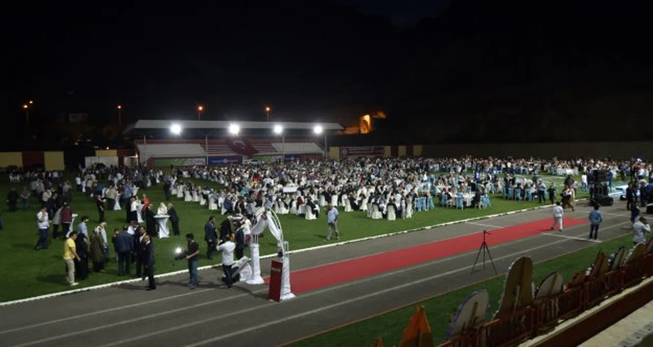 Stadyumdaki düğün töreni için yeşil sahaya 2 bin sandalye ile 300 masa yerleştirilirken, Mustafa Canlı ve eşi Müzeyyen Canlı’nın stadyum girişinde konuklarını tek tek karşıladı.