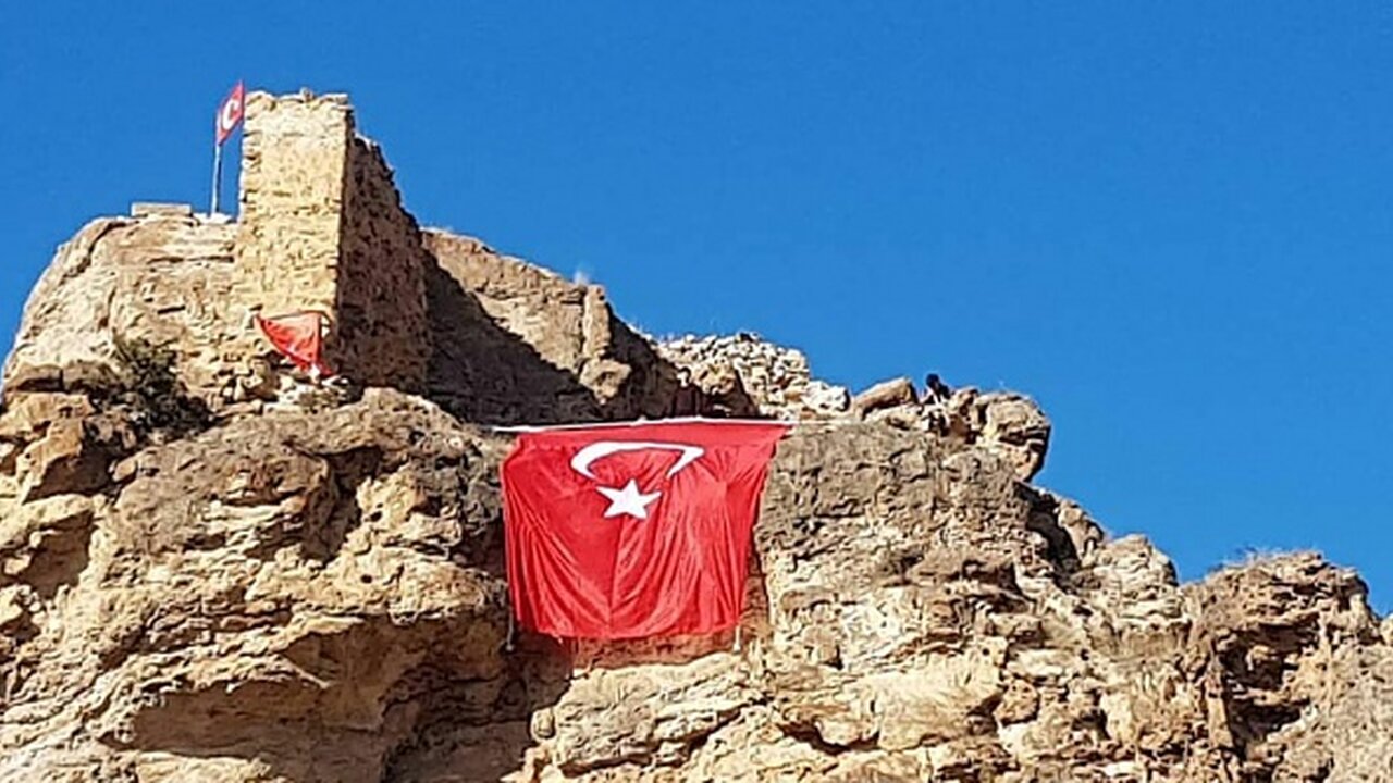 Akçakale kalesi mevkiine yaklaşık 2 saatlik tırmanışın ardından dev Türk Bayrağını kaleye asan gençler, Afrin operasyonunu desteklediklerini duyurdu.