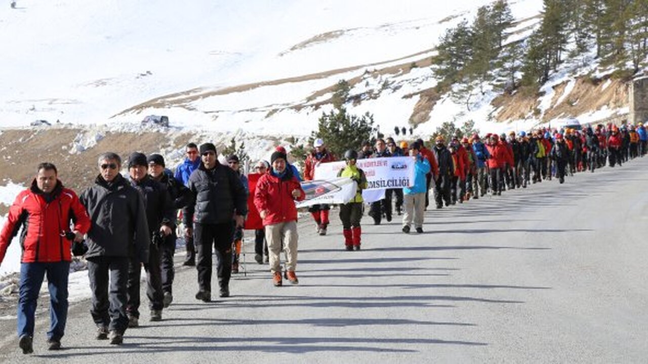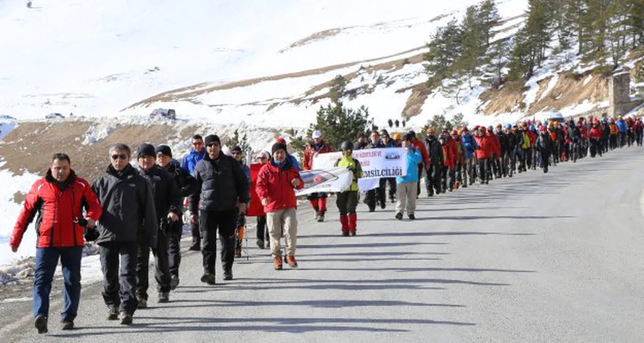 Zigana Dağı’na kış temel eğitim kampı kuran Türkiye Dağcılık Federasyonu, Trabzon Tenis Dağcılık Kayak İhtisas Kulübü (TEDAK) ve Gümüşhane Dağcılık Doğa Sporları Kulübü (GÜDAK) üyesi yüzlerce sporcu kamp alanından törenin yapılacağı anıta kadar olan 2,5 kilometrelik bölüme yürüyerek geldi.