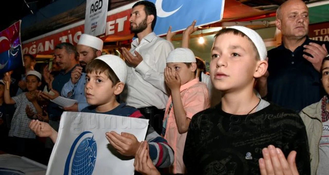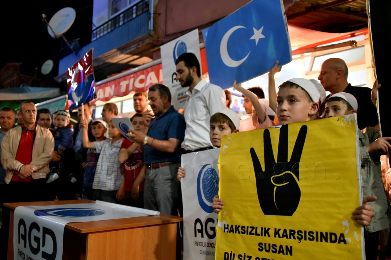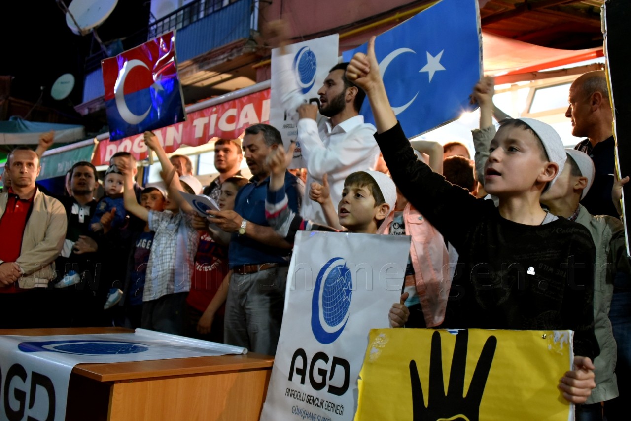 Teravih namazının ardından Merkez Kemaliye Camii önünde gerçekleştirilen programda AGD Gümüşhane Şube Başkanı Naci Şenel, Çin yönetimini sert sözlerle eleştirirken, konuşması sırasında alanda bulunanlar tarafından “Kahrolsun kızıl Çin”, “Avrupa değil İslam Birliği” sloganları atıldı ve tekbirler getirildi.