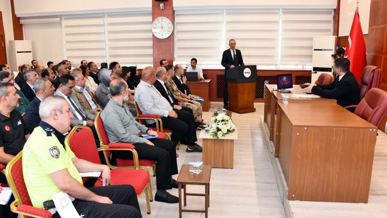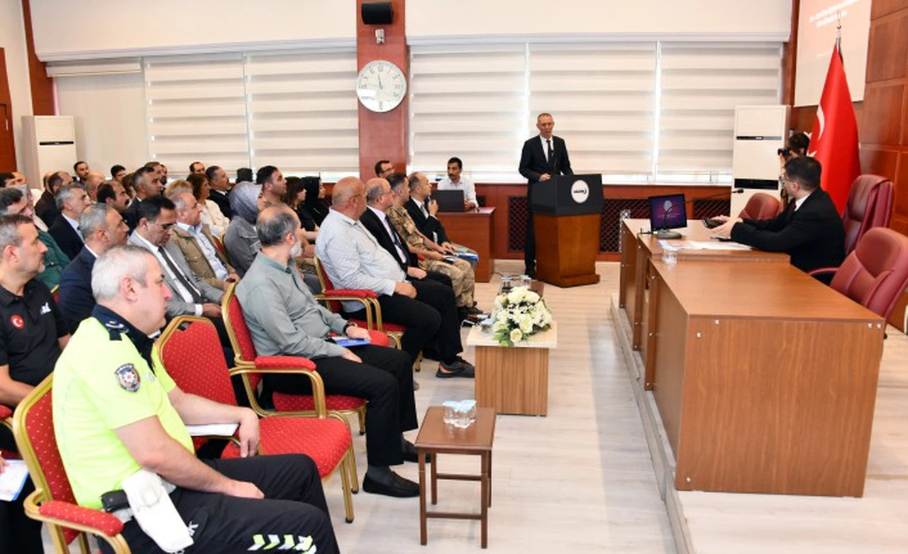 Kamu kurum müdürleri ve il genelindeki okul ve kurum yöneticilerinin katılımıyla Valilik Toplantı Salonunda geçekleştirilen toplantıda okul çevresi güvenliğinin sağlanması için yapılan çalışmalar ve alınacak önlemler değerlendirildi.