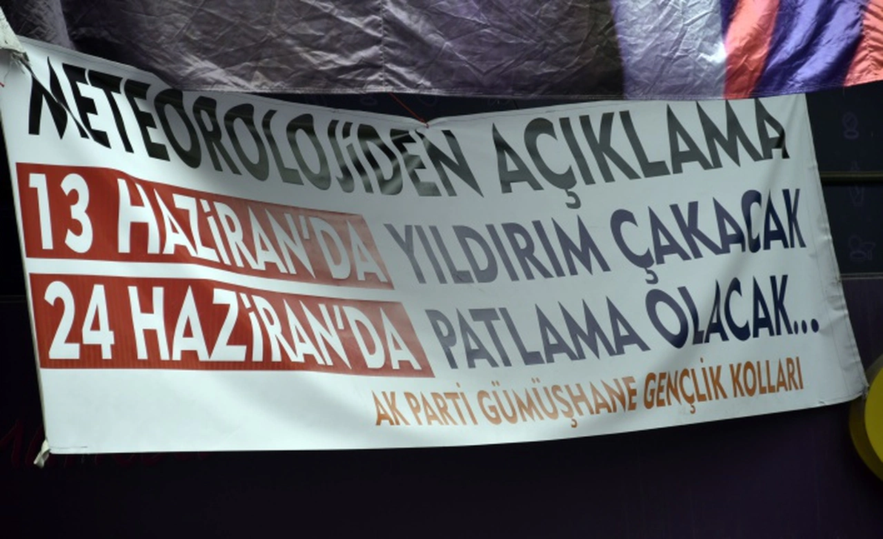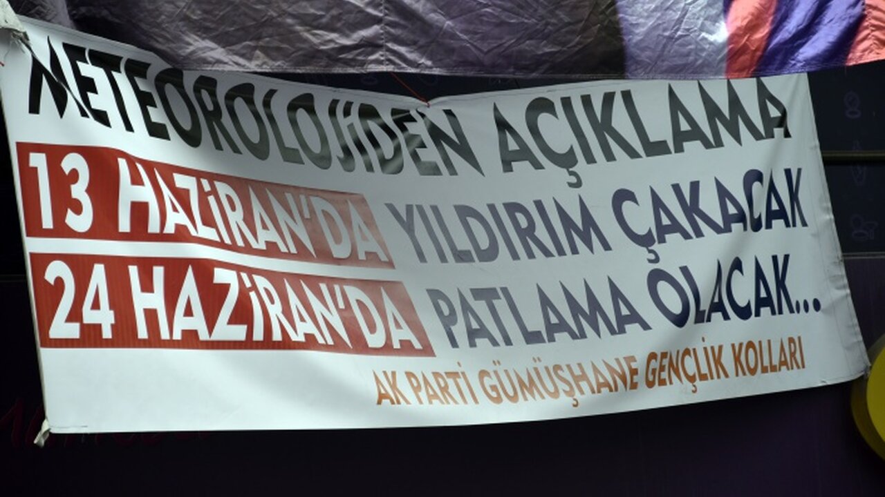 "Meteoroloji'den açıklama. 13 Haziran'da YILDIRIM çakacak, 24 Haziran'da PATLAMA olacak..." yazılı pankartta son Başbakan Binali Yıldırım’ın şehri ziyaret tarihi ve soy ismiyle ilişkilendirilirken, 24 Haziran’da da sandıklardan rekor oy çıkacağı vurgulandı.
