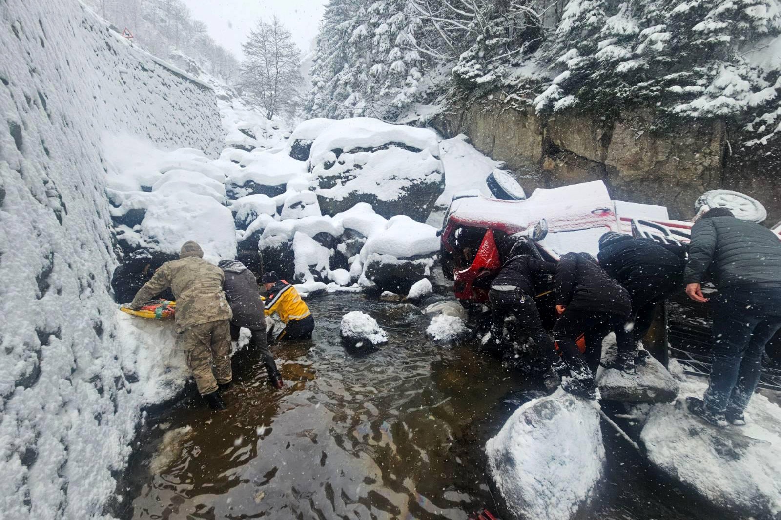 İhbar üzerine bölgeye çok sayıda ekip sevk edilirken, 112 Acil Sağlık ekipleri Jandarma, Özkürtün Belediyesi İtfaiye ve vatandaşların yardımıyla dere yatağından çıkardıkları yaralıların ilk müdahalesini olay yerinde yaptı.
