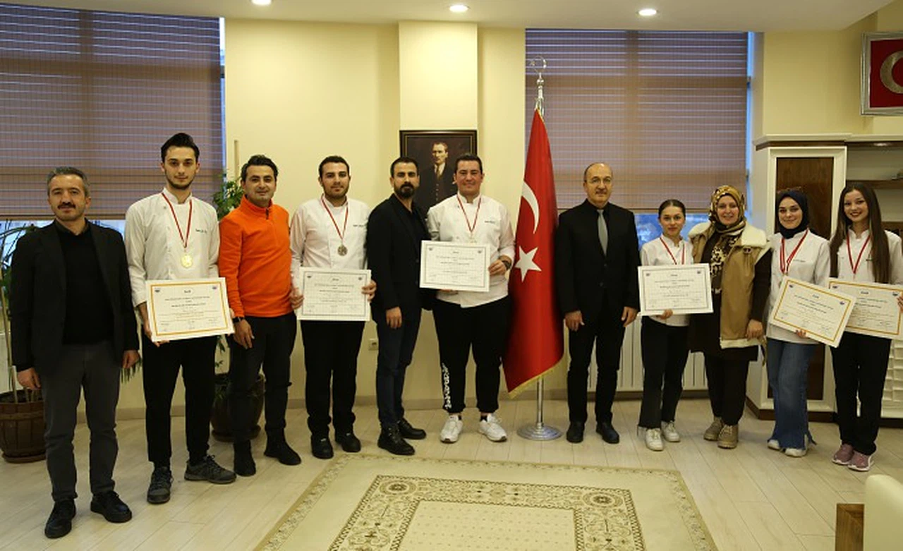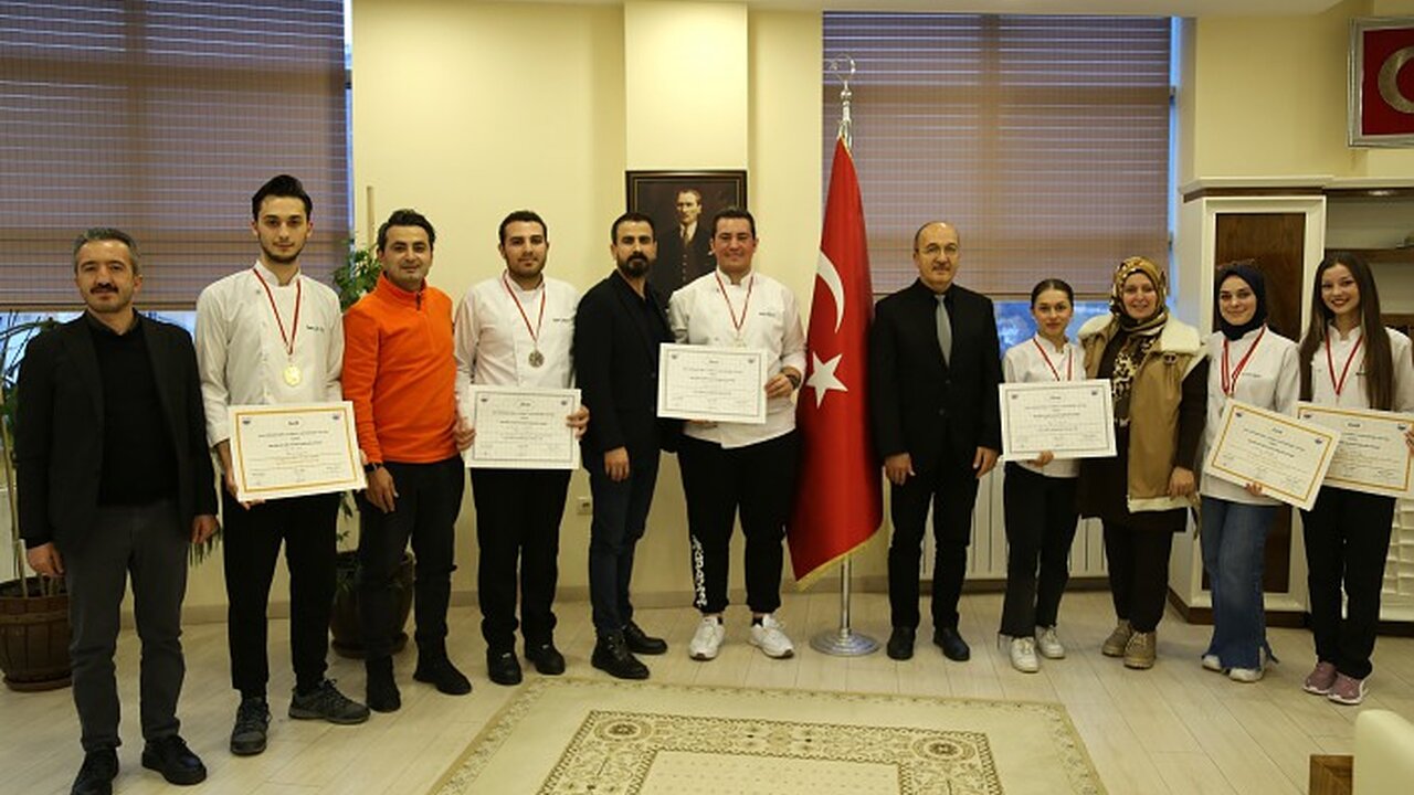 Rektörlük makamında gerçekleştirilen törene başarı gösteren öğrenciler ile Turizm Fakültesi Dekanı Prof.Dr. Sevim Beyza Öztürk Sarıkaya, Dekan Yardımcısı Doç. Dr. İsmail Çalık, Gastronomi ve Mutfak Sanatları Bölümünden Doç. Dr. Savaş Evren ve Öğr. Gör. Rıfat Pir katıldı.