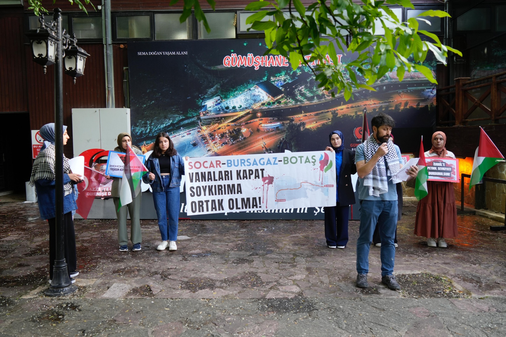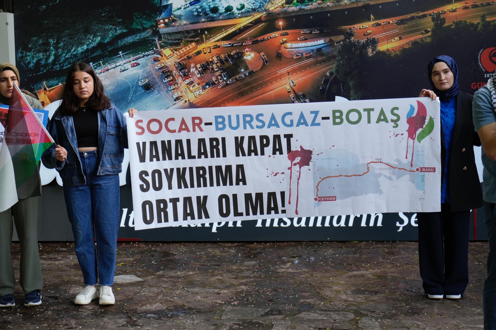 Sema Doğan Yaşam Alanında grup adına Alperen Gençosmanoğlu ve Tülay Altun’un okuduğu basın açıklamasında “Petrol İsrail'e aktıkça soykırım sürüyor!” ifadeleriyle Gazze'de katliam devam ederken siyonistlere Kazakistan ve Azerbaycan petrolünün Türkiye üzerinden taşındığı hatırlatıldı.