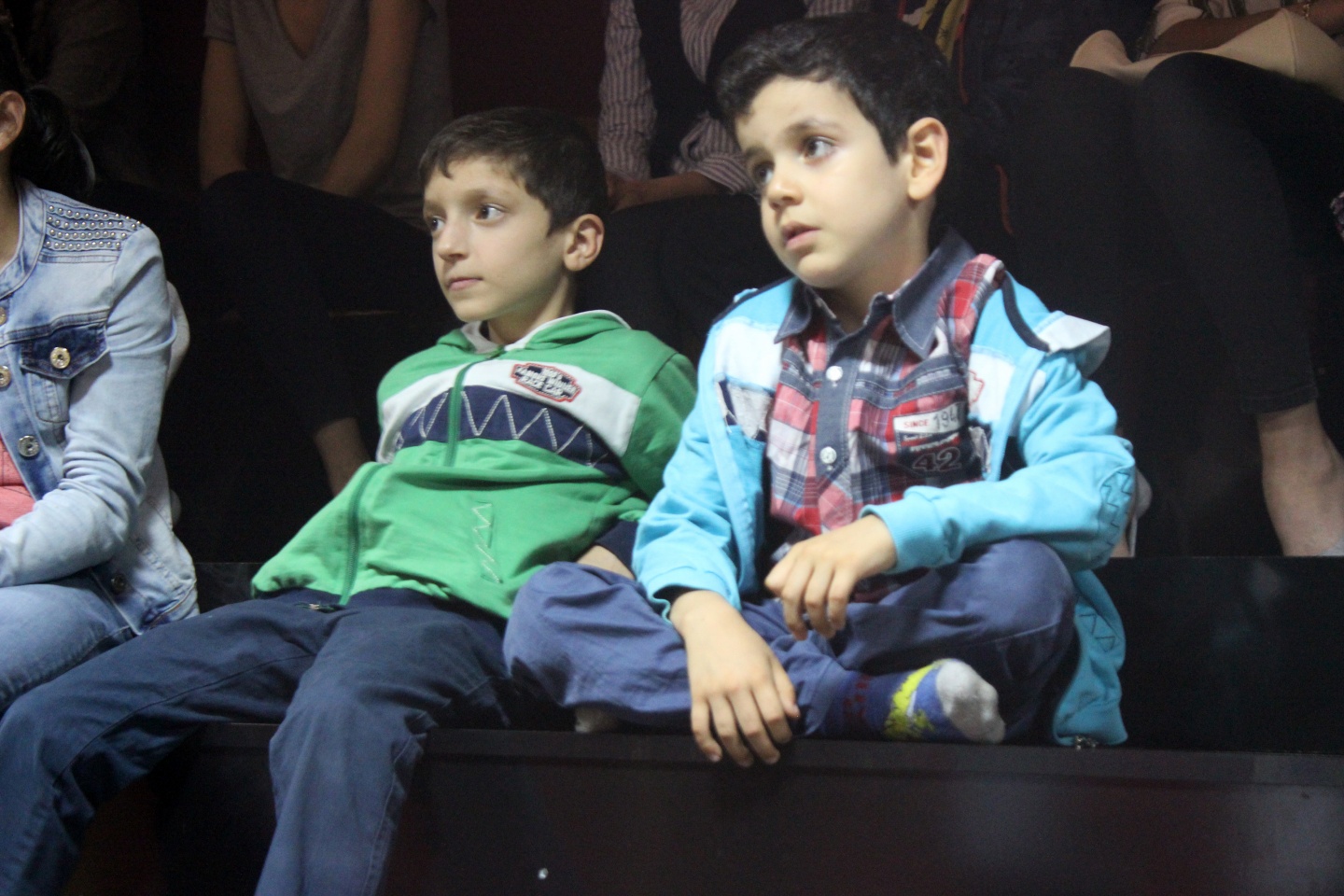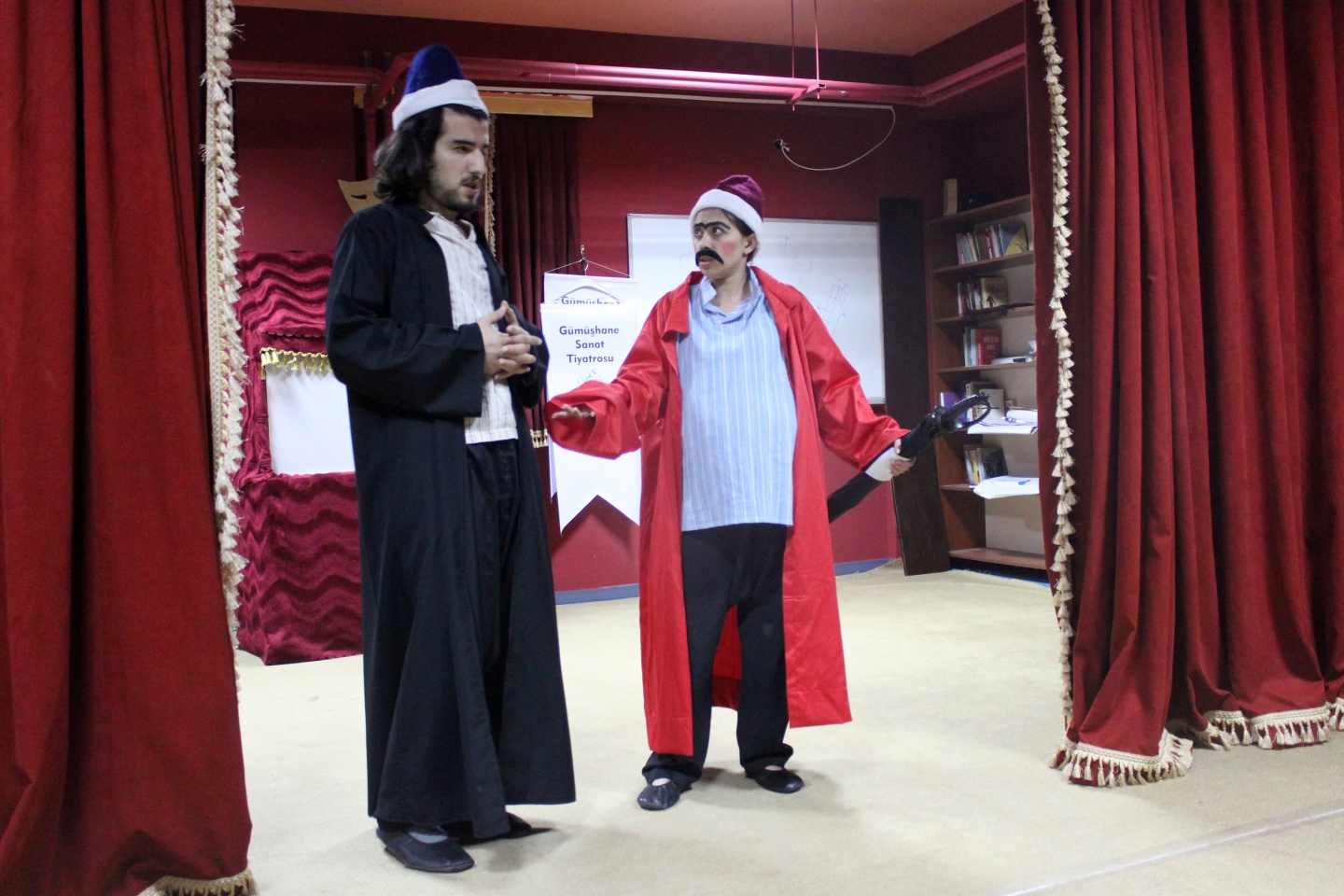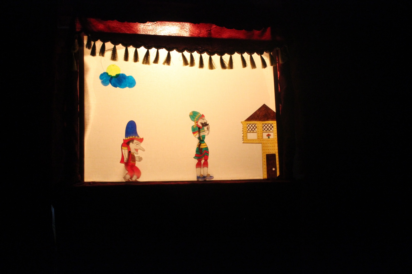 İlk olarak tarihi karakterlerin geçmişinden bahseden Tiyatro Eğitmeni Mesut Budak, çocuklara şöyle hikayeli bir anlatım ile aktardı: “Hacivat ve Karagöz Osmanlı Padişahlarından Orhan Gazi döneminde yaşayan iki tane taş ustasıymış. Bunların asıl isimleri Hacı İhvat ve Kara öküz iken zaman onların isimlerini Hacivat ve Karagöz olarak dile getirerek kullandırmıştır. Bu Hacivat ile Karagöz taş ustası olarak Bursa Ulu Camii'nin inşasında çalışırken sürekli birbirlerine sataşır ve eğlenceli olarak kavga ederlermiş. Bu kavgalarını seyreden diğer işçiler ise gün boyu gülmekten hiç bir iş yapamazlarmış. Gel zaman git zaman Orhan Gazi Ulu Camii'nin inşasını ve ne zaman biteceğini sorduğunda Veziri Hacivat ve Karagöz yüzünden caminin tamamlanamayacağını söylemesi üzerine tez kelleleri vurulsun denilmiş. Bunun sonucunda onların bu komik ve eğlenceli halleri birer güldürü unsuru olarak günümüze kadar ulaşmıştır.”