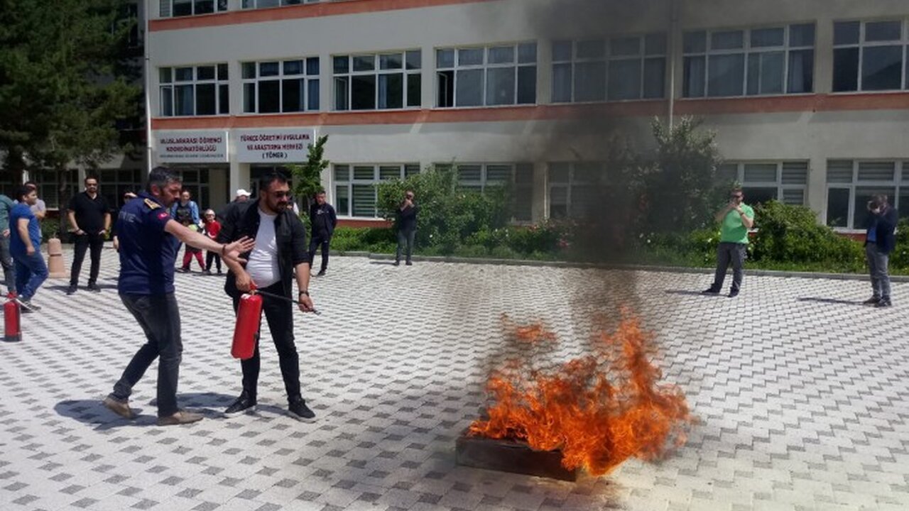İtfaiye Amiri Muhammet Aydın’ın yangın türleri, yangına müdahale şekilleri, söndürücü madde çeşitleri ve yangın riski doğuran etkenler gibi konularda teorik bilgiler vermesi ve yangına müdahale şekillerinden bahsetmesinin ardından üniversitedeki binalarda bulunan yangın söndürme ekiplerinin katılımıyla tatbikatın uygulamasına geçildi.