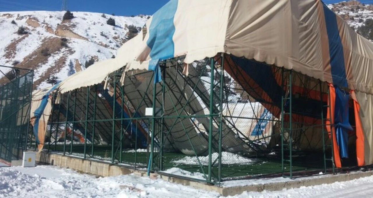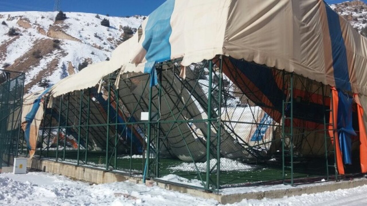 Son yılların en çetin Aralık ayını geçiren Gümüşhane’de ağır kar yüküne dayanamayan ve eskimiş olması nedeniyle yenilenmesine karar verilen halı sahanın önce üzerindeki bez brandası yırtıldı, ardından tavan bağlantıları çöktü.
