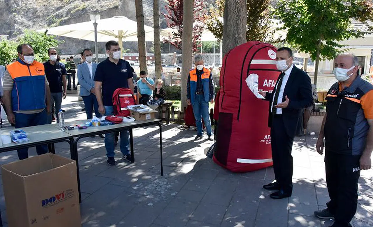 Vali Kamuran Taşbilek, AK Parti Gümüşhane Milletvekili Cihan Pektaş, Belediye Başkanı Ercan Çimen, İl Afet ve Acil Durum Müdürü (AFAD) Mesut Bayrak’la birlikte kurulan stanttaki deprem çantasında incelemelerde bulundu.