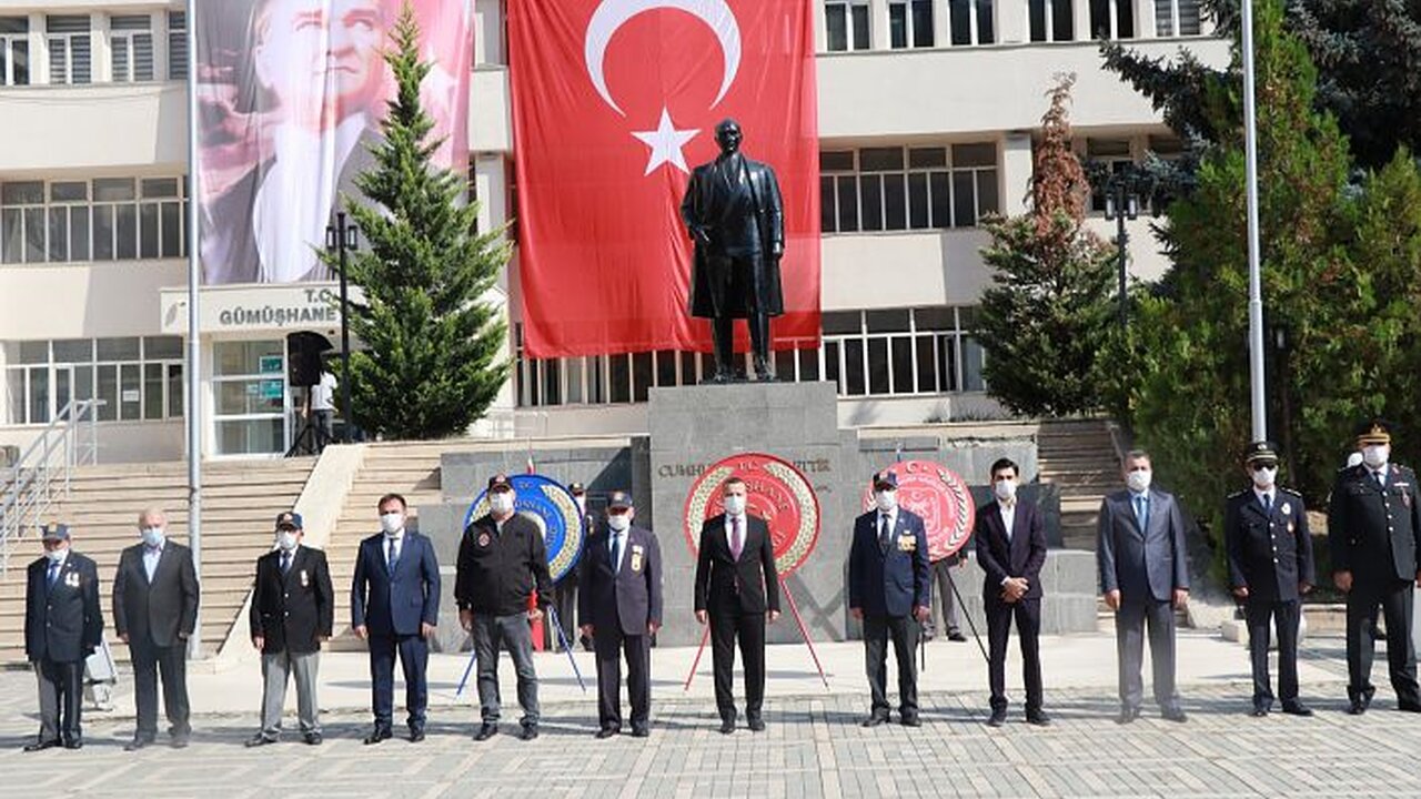 Anıt önündeki törende şehitler için saygı duruşunda bulunuldu ve İstiklal Marşı okundu. İstiklal Marşı'nın okunmasının ardından Gümüşhane Valisi Kamuran Taşbilek, Belediye Başkanı Ercan Çimen ile Muharip Gaziler Derneği İl Temsilcisi Celil Tanguroğlu gazilerle birlikte Atatürk Anıtı’na çelenk sundu ve ardından hatıra fotoğrafı çektirdi.