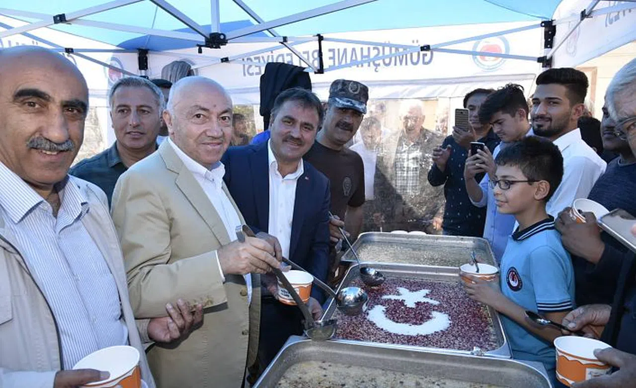 Merkez Kemaliye Camii avlusunda Cuma namazı çıkışında gerçekleştirilen etkinlikte AK Parti Gümüşhane Milletvekili Hacı Osman Akgül, Belediye Başkanı Ercan Çimen ve İl Emniyet Müdürü Ömer Faruk Karataş’ın katılımıyla vatandaşlara 2 bin kişilik aşure dağıtıldı.