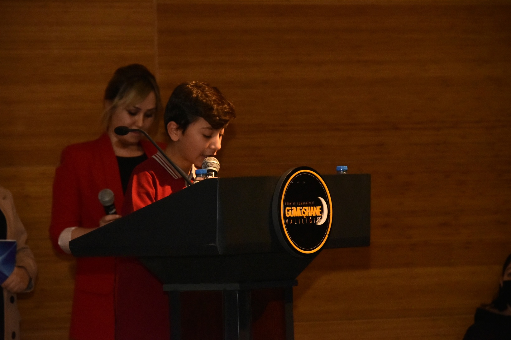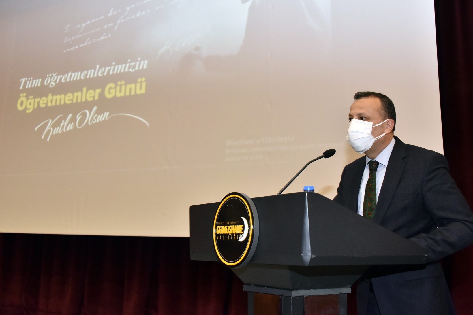 Buradaki programın ardından anma programı ise Gümüşhane Kültür Merkezinde gerçekleştirildi. TOBB Anadolu Kız İmam Hatip Lisesi tarafından düzenlenen programda konuşan Gümüşhane Valisi Kamuran Taşbilek, öğretmenlik mesleğinin çok kutsal ve kendini toplumun aydınlanmasına adanmış bir meslek olduğunu belirterek, “Kendilerini toplumun aydınlanma davasına adayan tüm öğretmenlerimize selam olsun. Sizler bizim için çok değerlisiniz, hepimiz sizlerin elinden geldik geçtik. Sizler olmasaydınız hiçbirimizin bir kıymeti olmayacaktı. Bütün toplumu şekillendiren, aydınlatan bir mum misali, kandil misali, kendisini yakarak toplumunu, dünyayı aydınlatan geliştiren en değerli, en güzel varlıklarsınız. Kıymetinizi anlatmaya bizim sözlerimiz yetmez. Memleketimizin evladı şehit öğretmenimiz Necmettin Yılmaz, Aybüke Yalçın kızımız, Abdurrahman Nafiz Özbağrıaçık abimizin şahsında, değerli şehitlerimizin şahsında başta bu kutsal dava uğrunda şehit olan, canlarını feda eden değerli öğretmen şehitlerimizi ve bütün şehitlerimizi rahmetle anıyor onların şahsında sizlerin öğretmenler gününü kutluyorum” dedi.