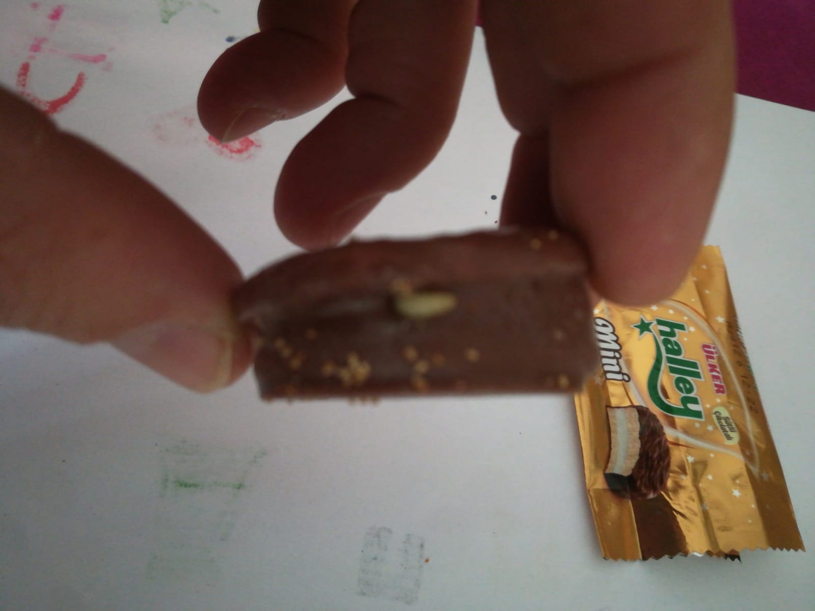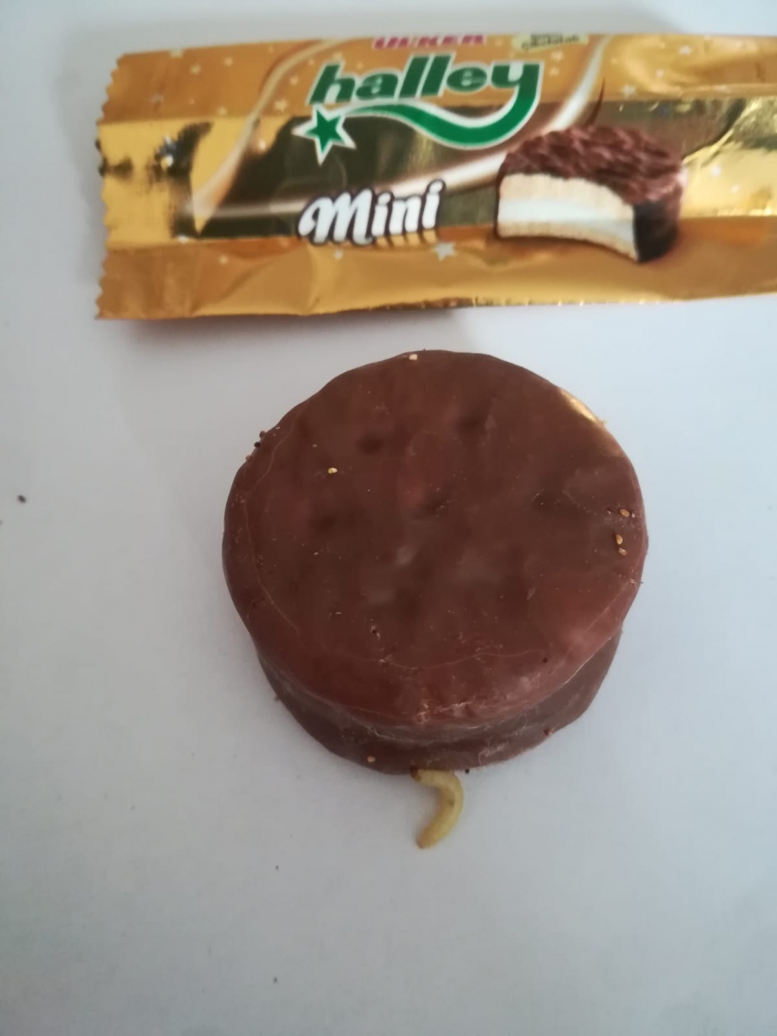 “Bugün Migros'tan aldığım ve SKT geçmeyen Ülker halleyden kurt çıktı şok oldum. Paket sapasağlamdı. Diğer Halley lerin de üzerinde larvalar var. Koruyucu olan bir ürünün kurtlanması ne demek oluyor? Kaç yıllık bu ürünler? SKT yanlış mı bu ürünlerin? Aklımın ucundan geçmediği için bir ısırık aldım o an fark ettim.”