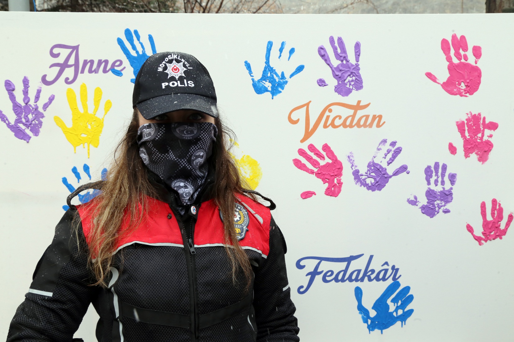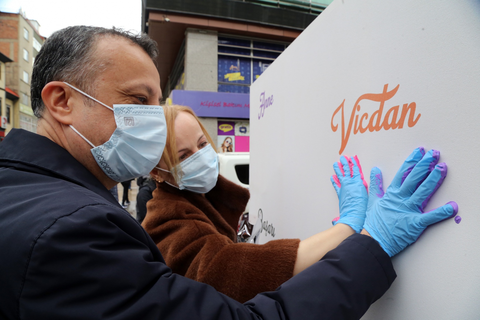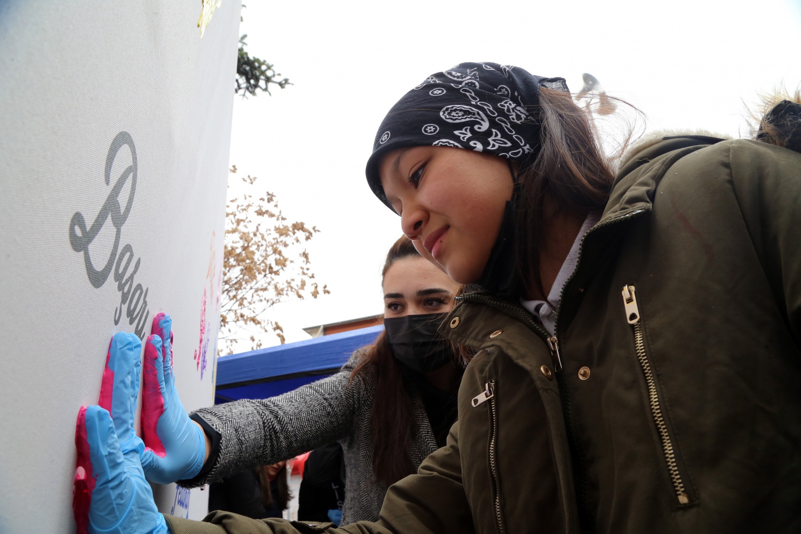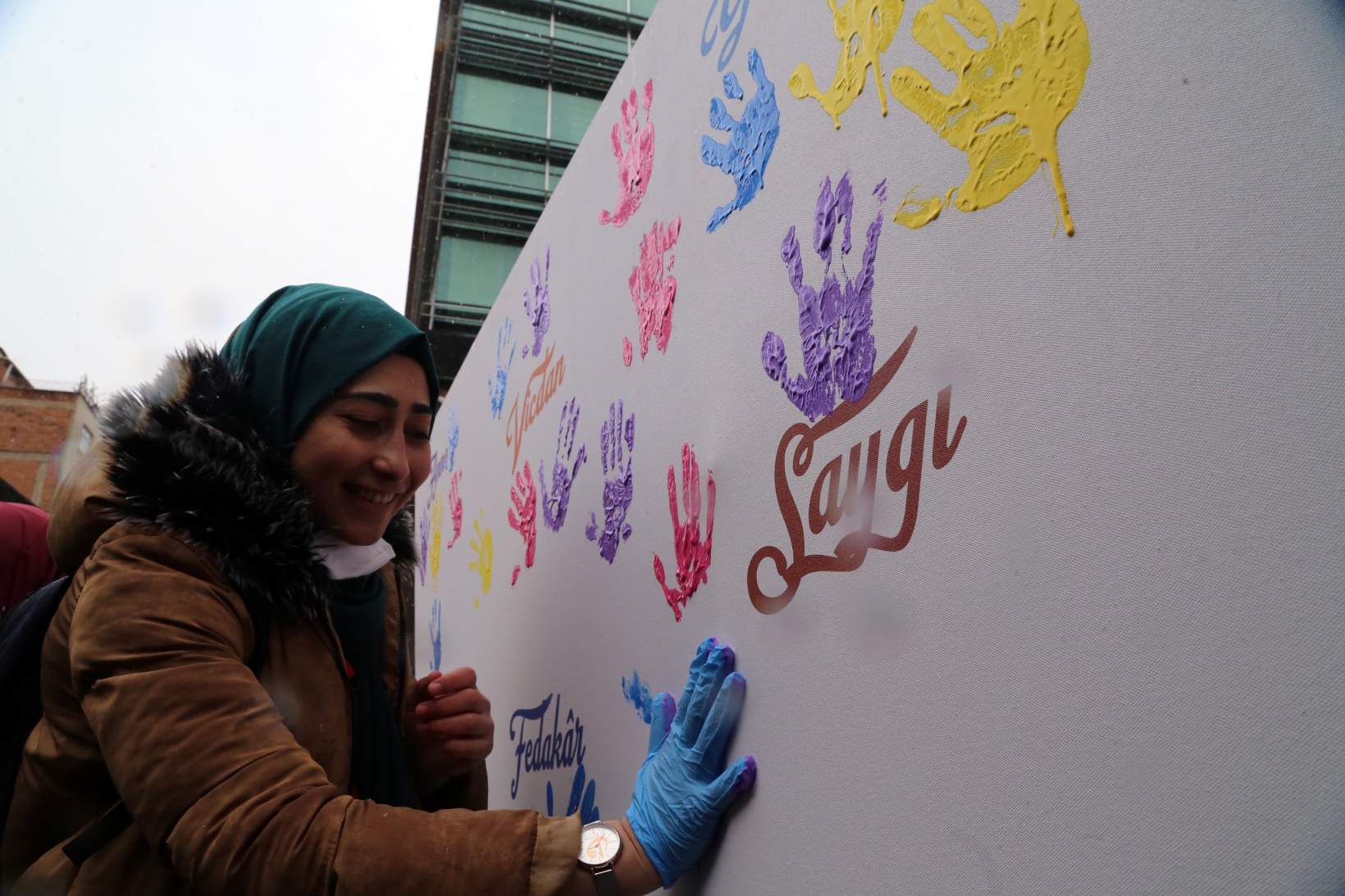 Günün anısına karanfil takdim edilen, broşür dağıtılan alanda kurulan tuval üzerine kadınlar ellerini boyaya daldırıp el izlerini bıraktı.