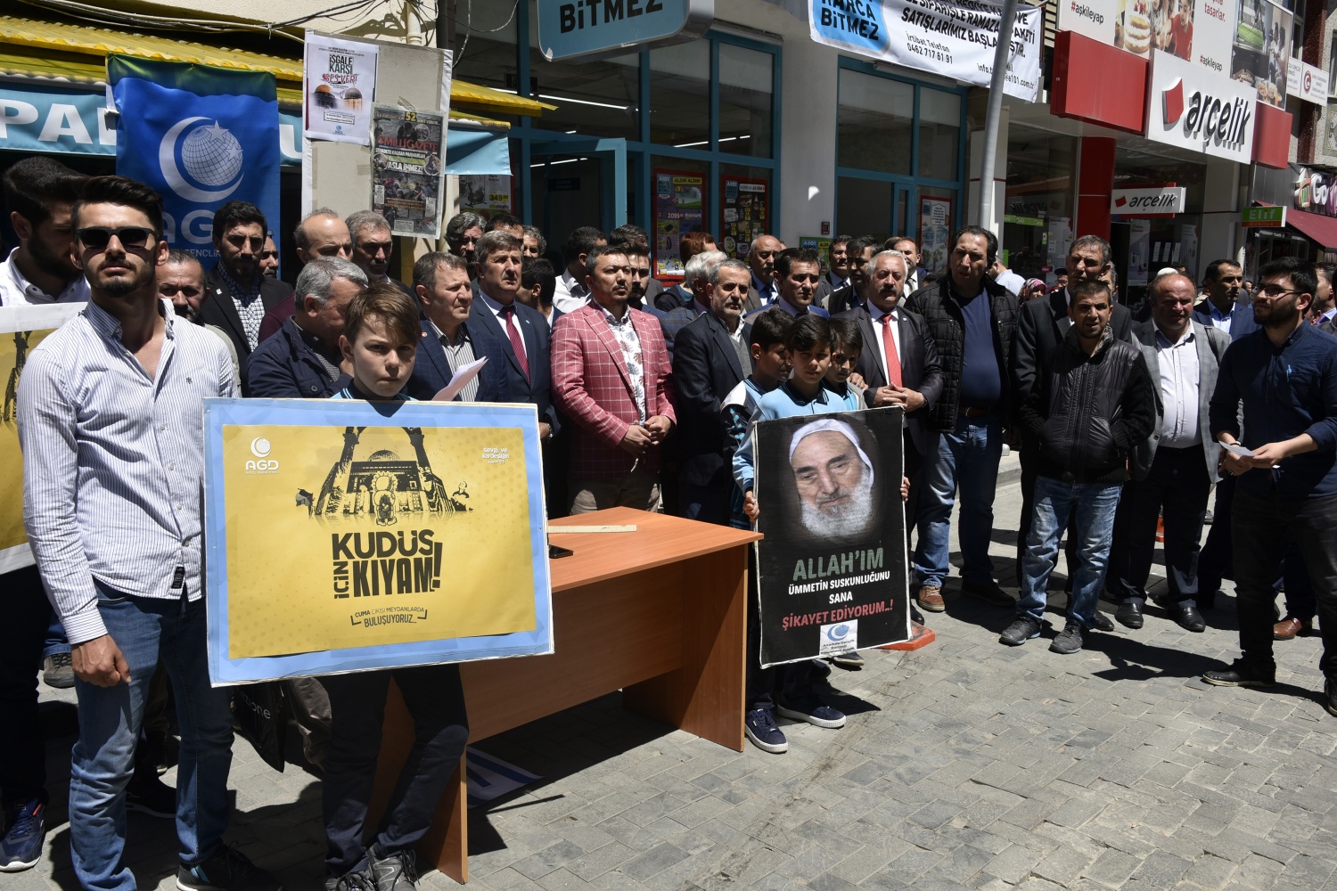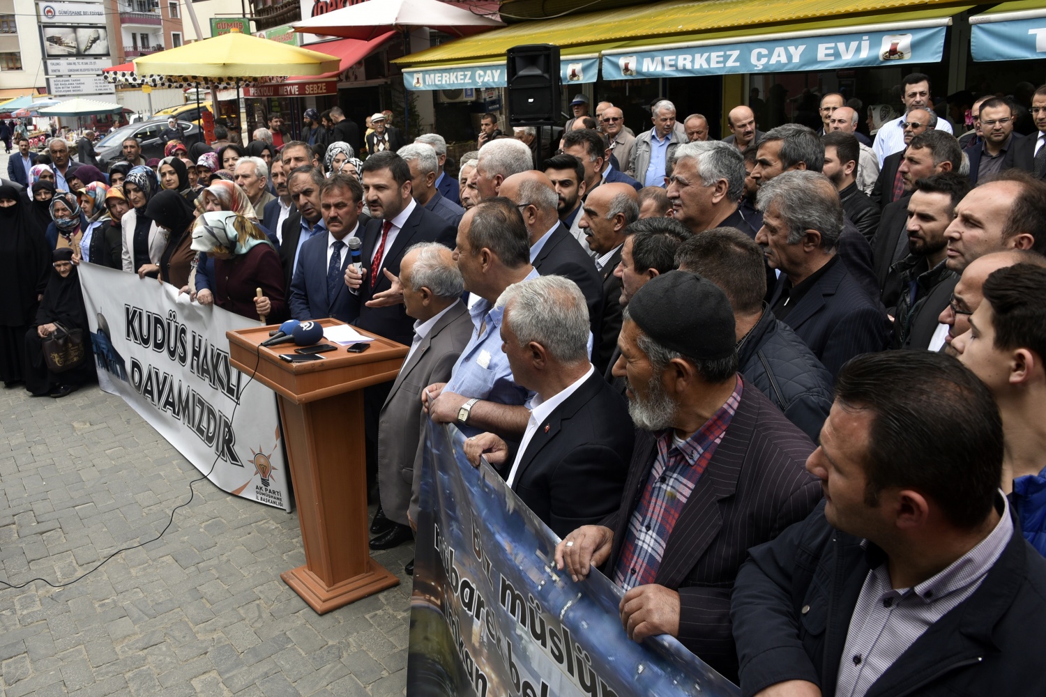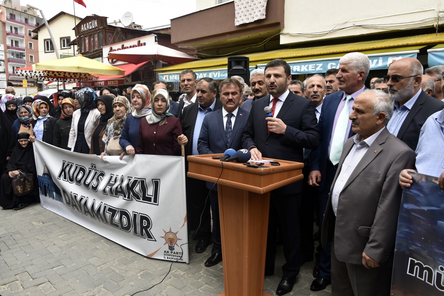 Burada konuşan AK Parti İl Başkanı Av.Celalettin Köse, Amerika Birleşik Devletleri’nin Büyükelçiliğini Kudüs’e taşımasını ve İslam’ın ilk kıblesi kadim Kudüs’ü İsrail’in başkenti olarak tanıma girişimini kabul etmelerinin mümkün olmadığını ve bu girişimin kendileri için yok hükmünde olduğunu söyledi.