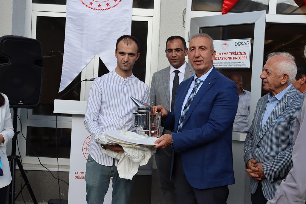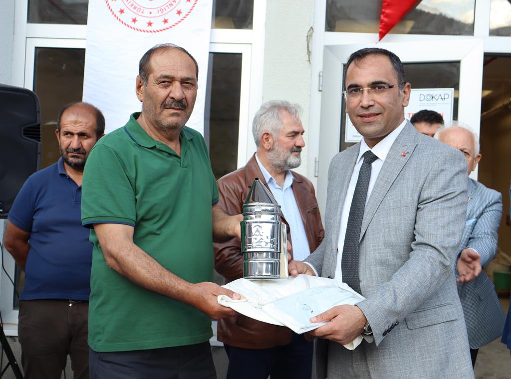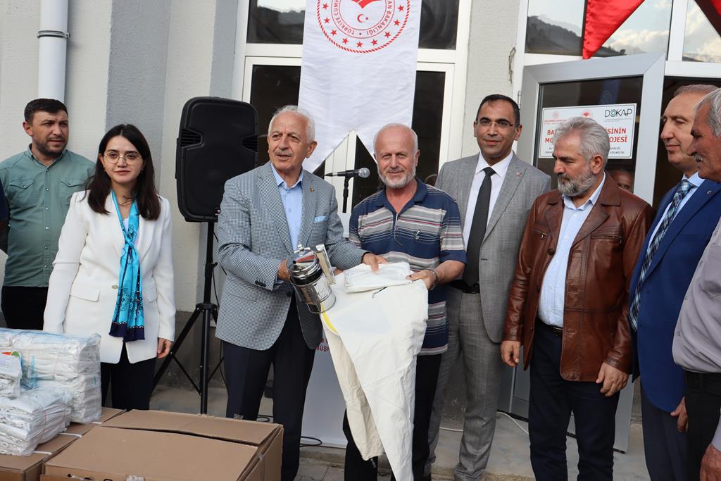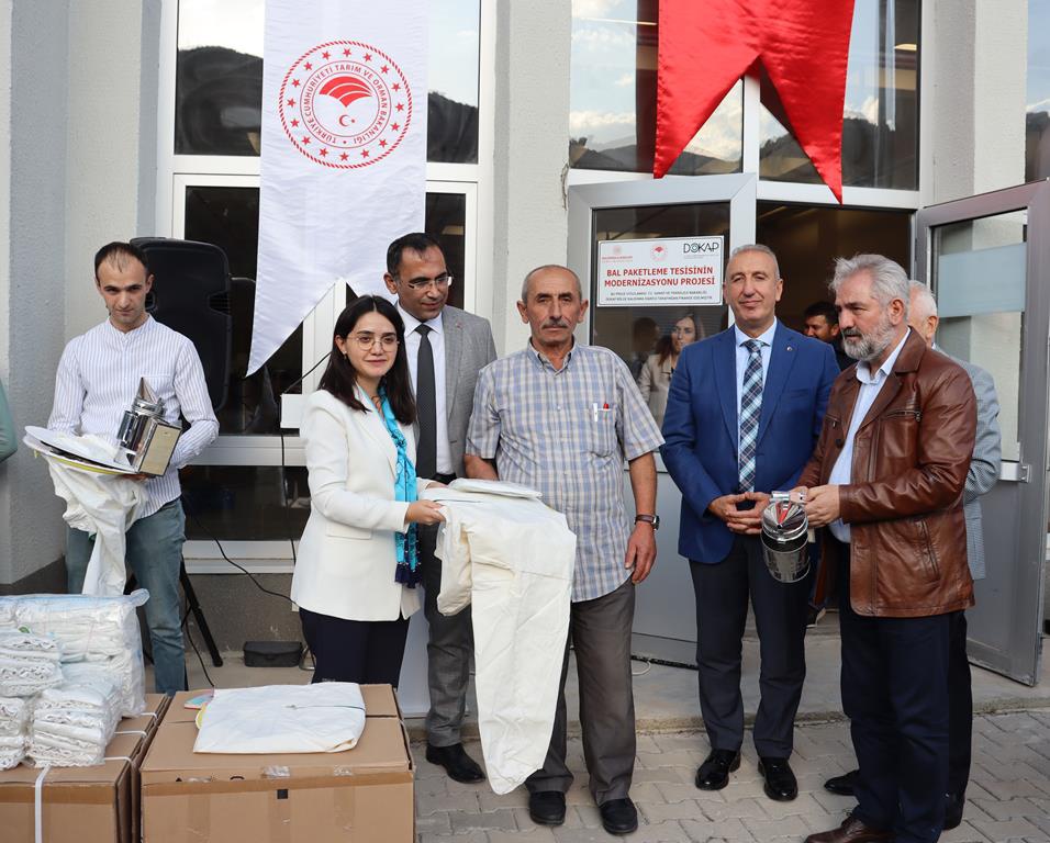 Arı Keki Üretim Tesisi ve Bal Paketleme tesisi hakkında Vali Yardımcısı Bahar Kaya ve katılımcılara bilgi verilmesinden sonra arıcılara yine DOKAP tarafından yüzde 70 hibeli finanse edilen koruyucu maske, eldiven ve körük gibi arıcılık malzemeleri dağıtıldı.