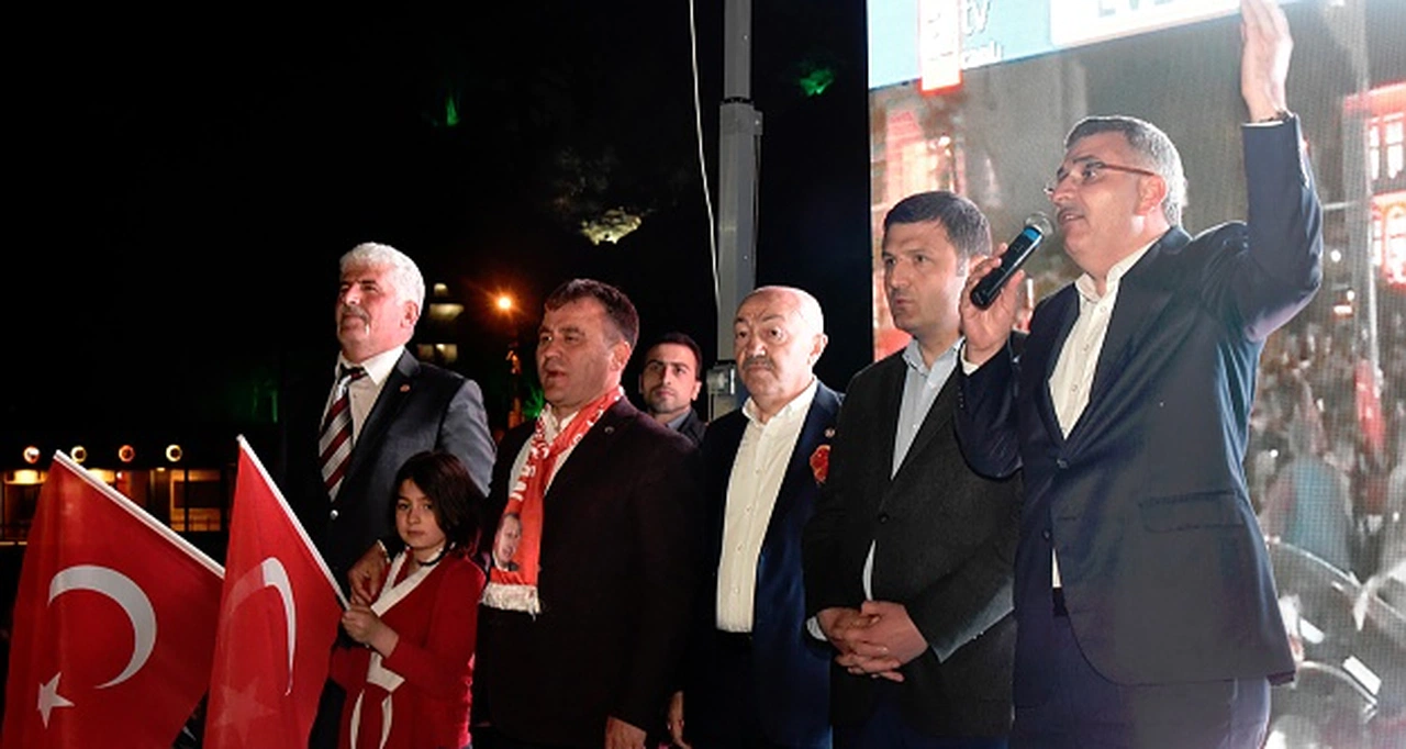 AK Parti Gümüşhane Milletvekili Hacı Osman Akgül, Belediye Başkanı Ercan Çimen, AK Parti İl Başkanı Av.Celalettin Köse, MHP İl Başkanı Nadim Aydın’ın el ele çalan davul-zurna eşliğinde yöresel halk oyunlarını oynadığı programda alana kurulan dev ekrandan Türkiye genelindeki seçim sonuçları anbean aktarıldı ve Başbakan Binali Yıldırım’ın konuşması dinlettirildi.