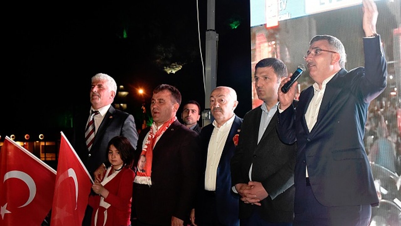 Seçim sonuçlarının belli olmasının ardından Belediye Başkanlığı binası önünde toplanan AK Parti ve MHP’liler ellerindeki Türk bayraklarıyla çalan müziklere eşlik eden vatandaşlar zaman zaman “Başkan Erdoğan” sloganları attı.