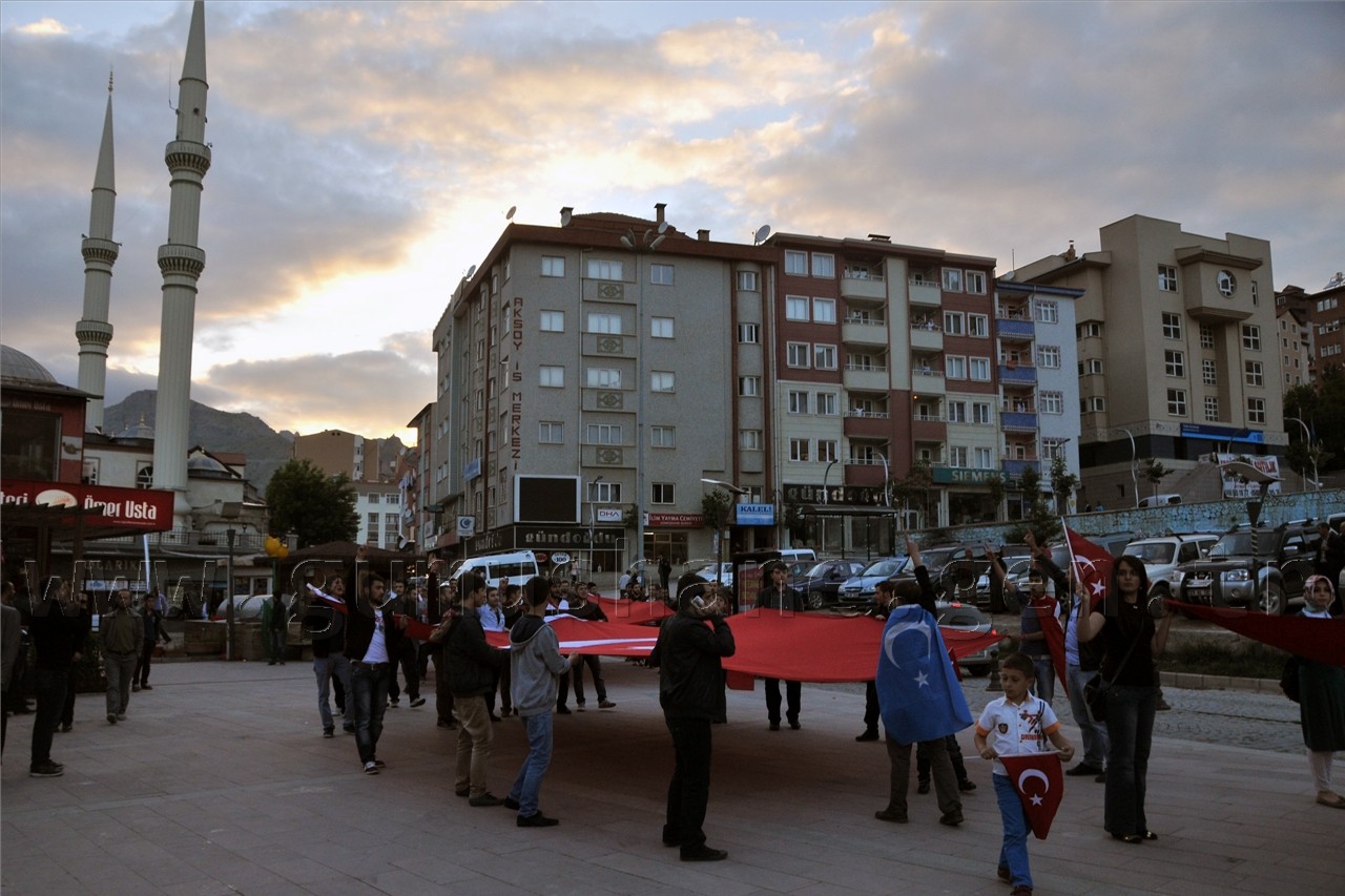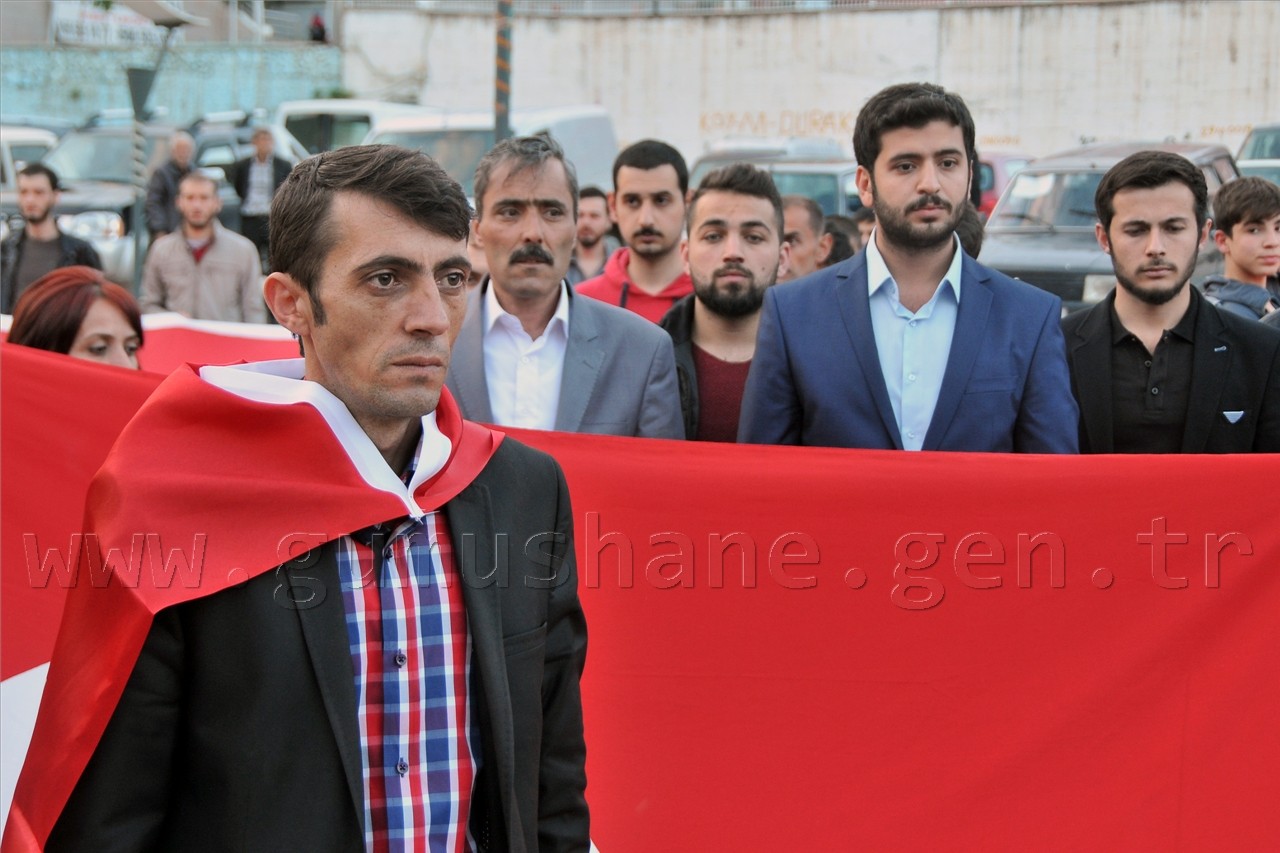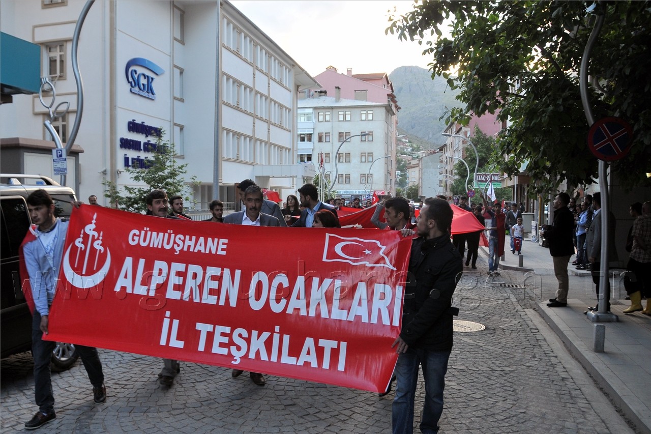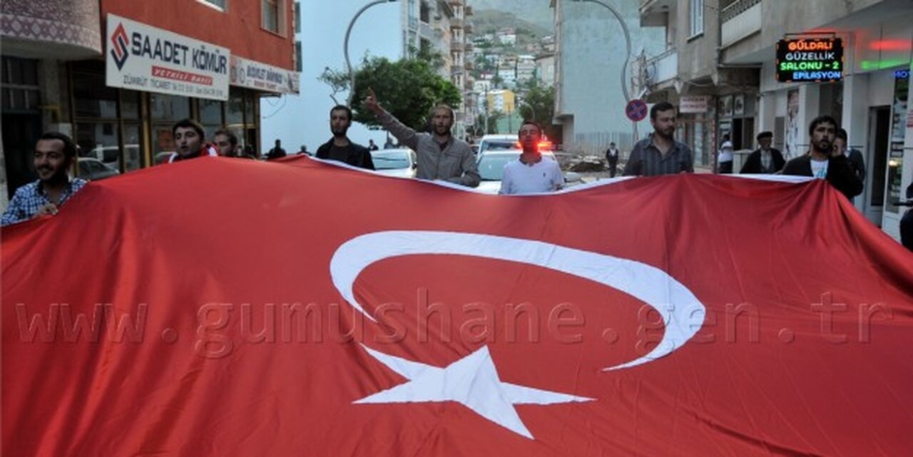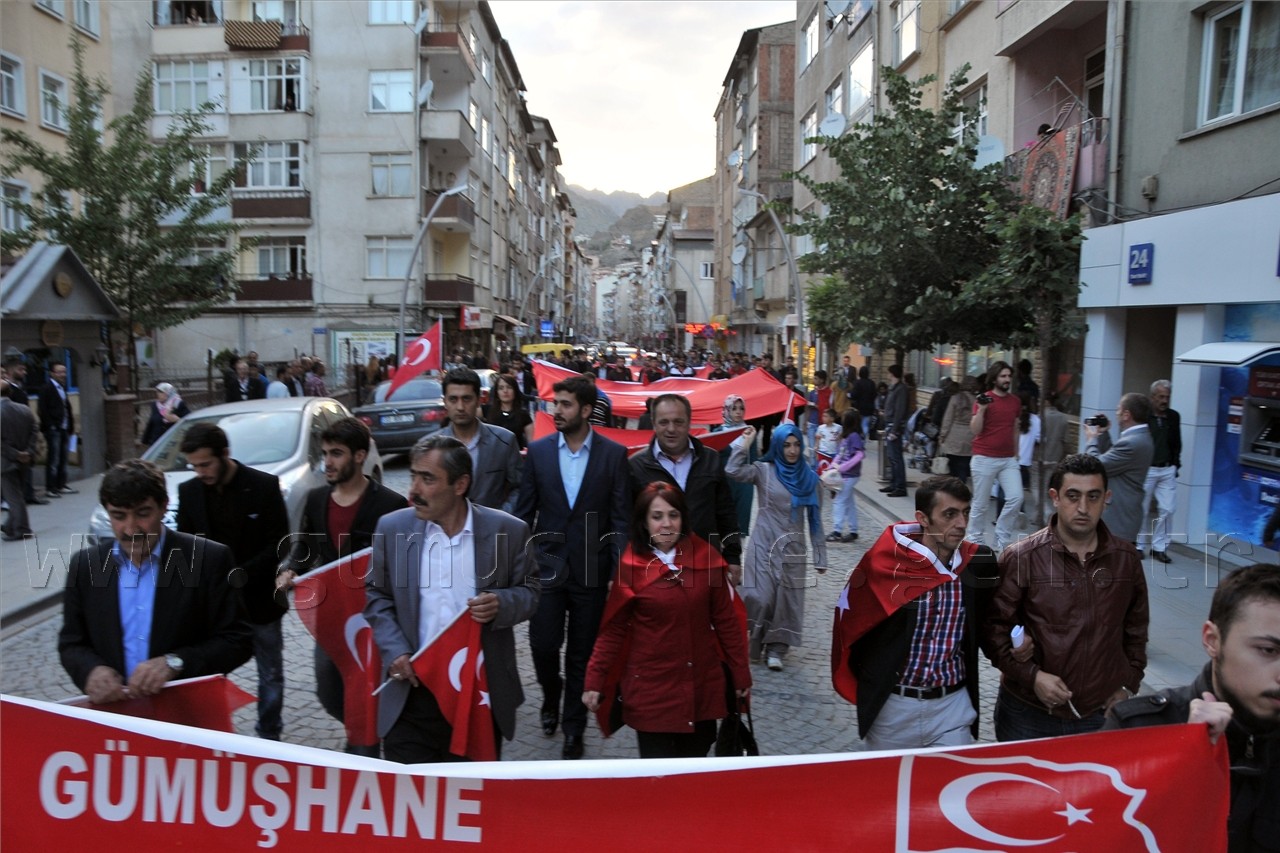 Tarım İl Müdürlüğü önünde toplanan Birleşen Altın Köyler Derneği, Gümüşhane Erzurumlular Derneği, Kadın Girişimciler Derneği ve Alperen Ocakları üyesi yaklaşık 50 kişilik grup, ellerinde taşıdıkları Türk Bayrakları ile birlikte slogan atarak Zafer Meydanına kadar yürüdü. “Bayrağa uzanan eller kırılsın”, “Bayrak namustur, namusuna sahip çık”, “Ben Türküm, Türk esir olmaz, Bayraksız olmaz, Ezansız olmaz”, “Gümüşhane uyan bayrağına sahip çık” sloganları atan ve tekbirler getiren grup adına açıklamayı Birleşen Altın Köyler Derneği Başkanı Engin Çelik yaptı.