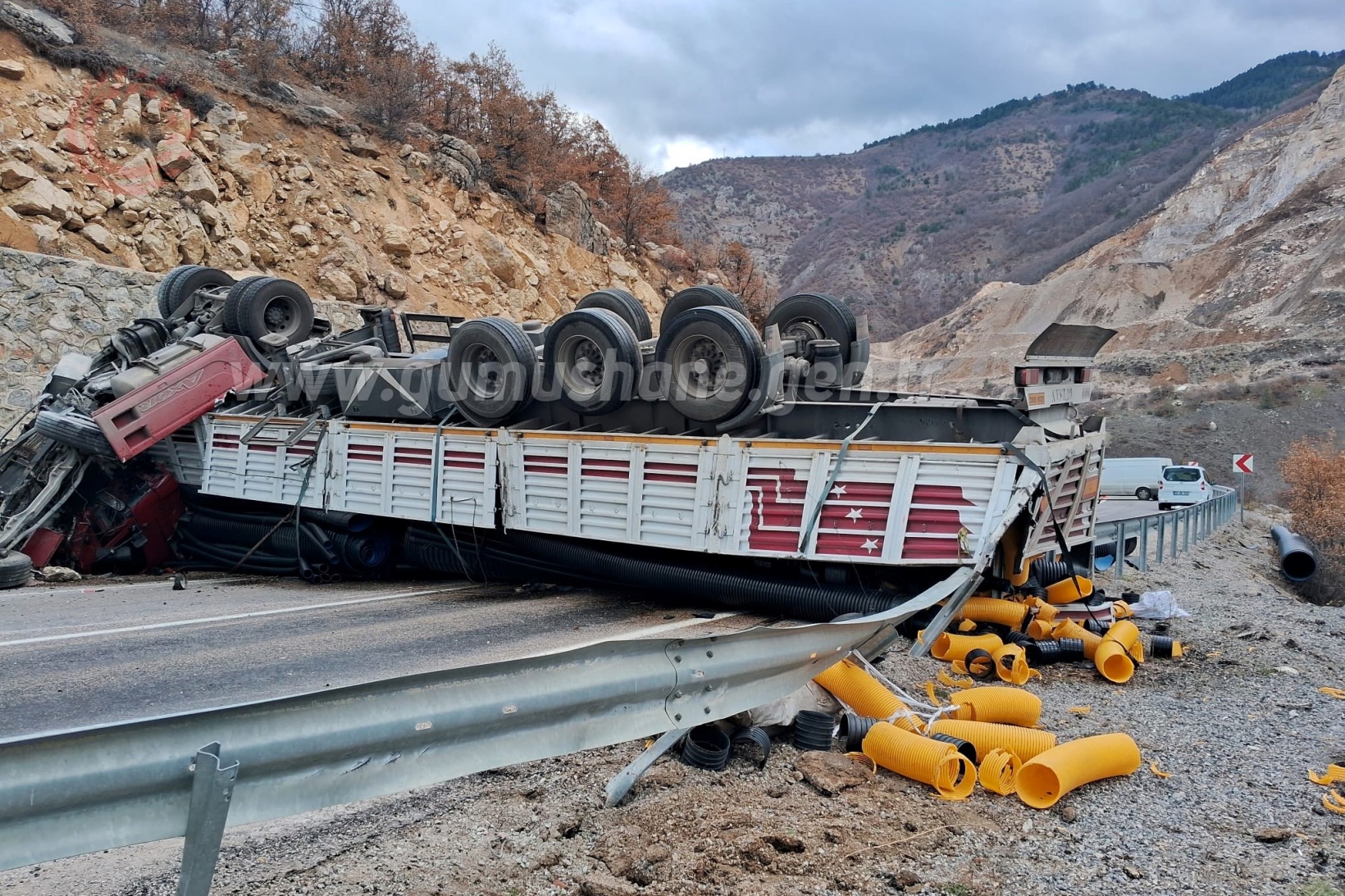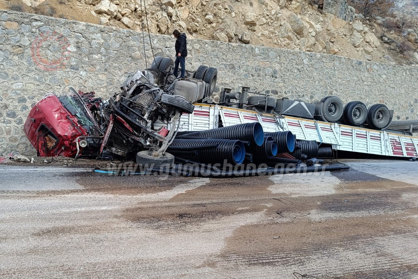 Gümüşhane Haberleri Galeriler Gümüşhane Gümüşhane’de boru yüklü tır duvara çarptı: 1 ağır yaralı
