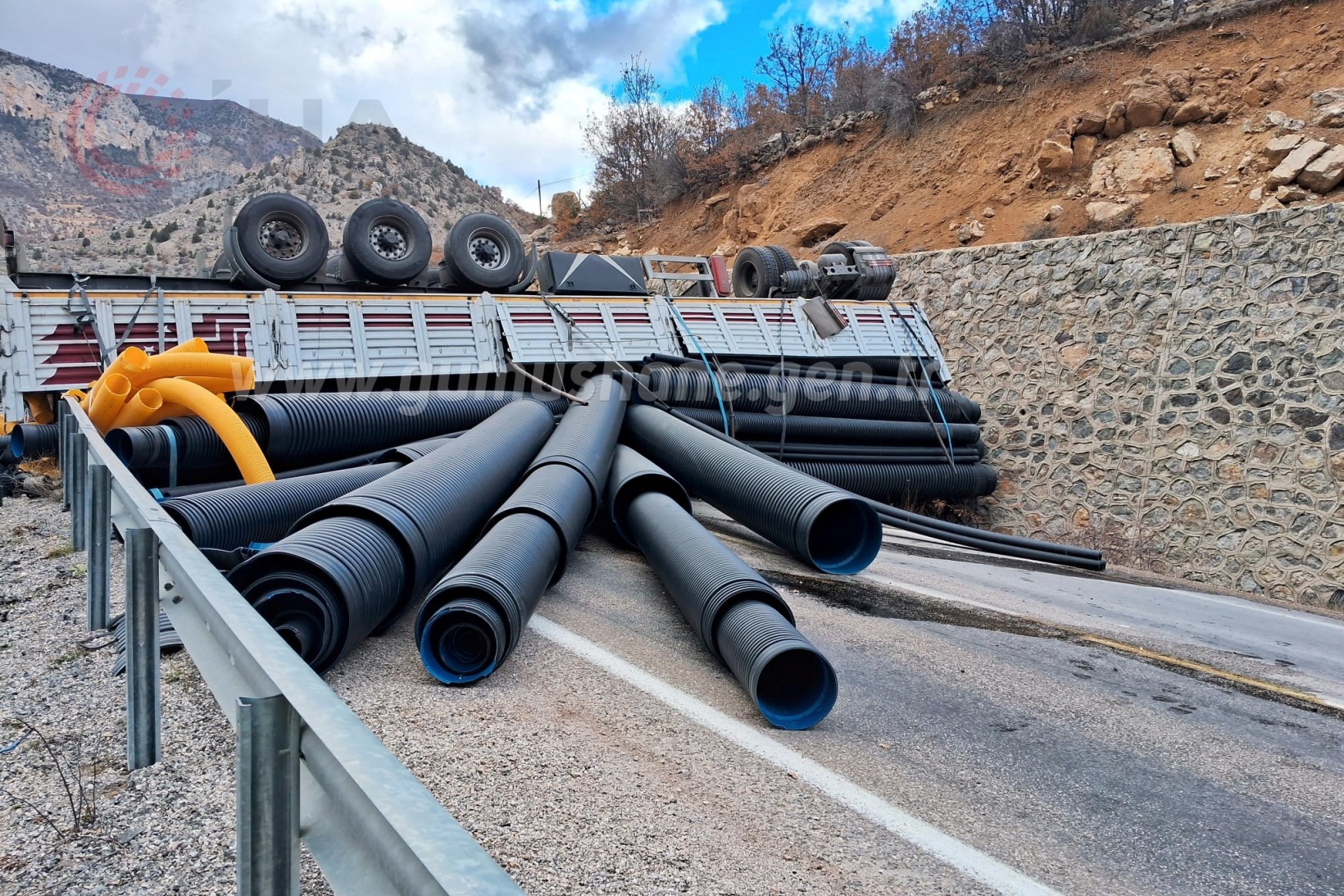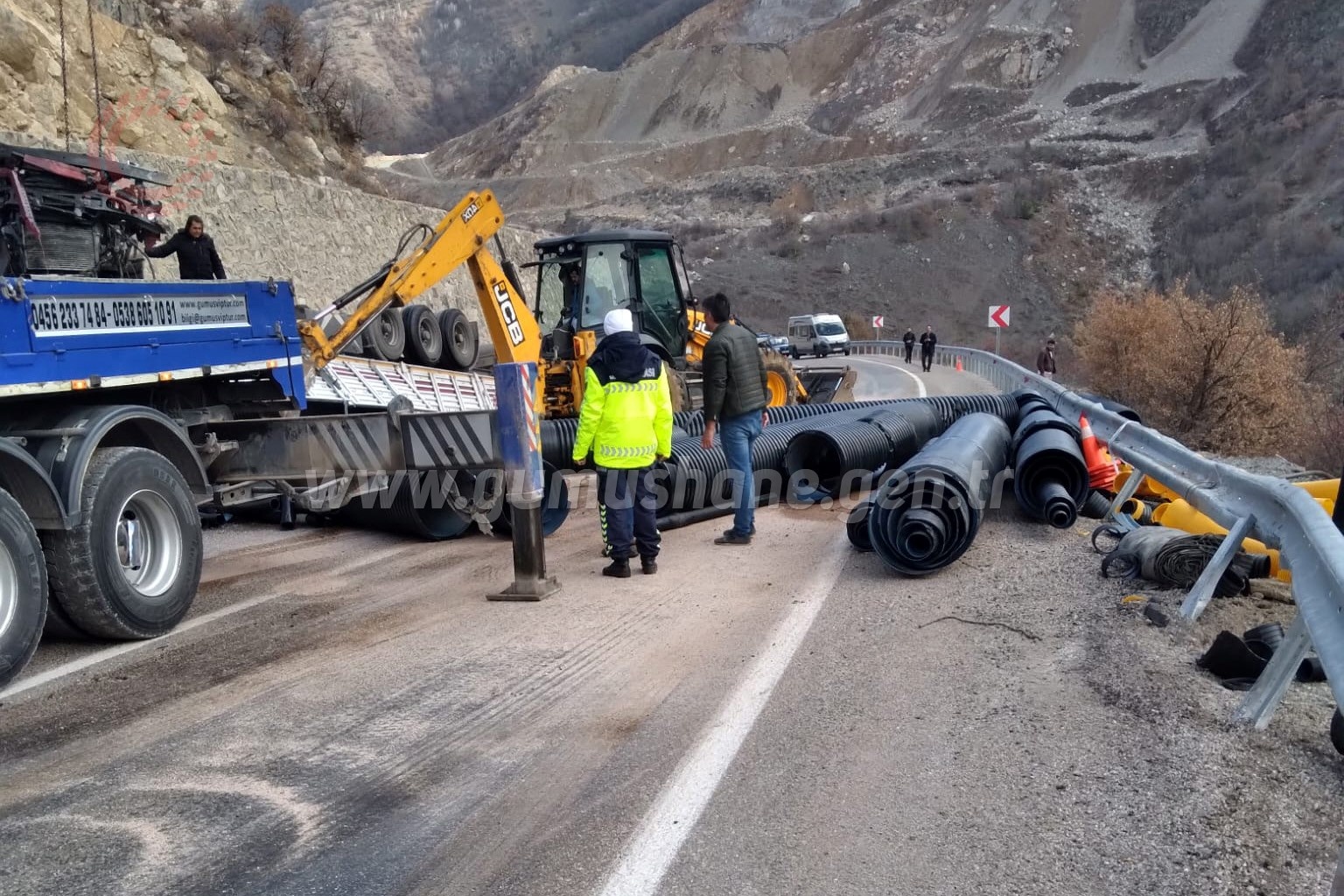 Kapanan yolun ulaşıma açılması için Jandarma ve Karayolları ekiplerin tırı ve yola devrilen boruları temizleme çalışmalarının ardından yol tek şeritten ulaşıma açılırken çalışmalar devam ediyor.