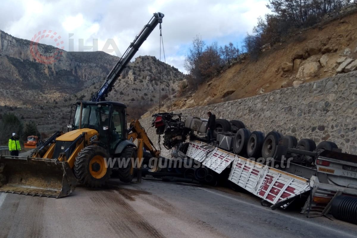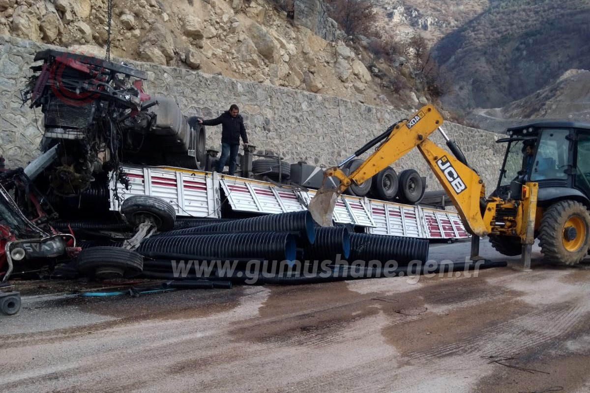 Gümüşhane’de İkisu-Şiran karayolunda kontrolden çıkan boru yüklü tır istinat duvarına çarptı. Kazada tır sürücüsü ağır yaralandı.