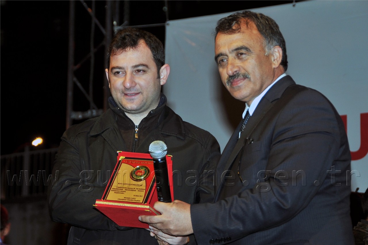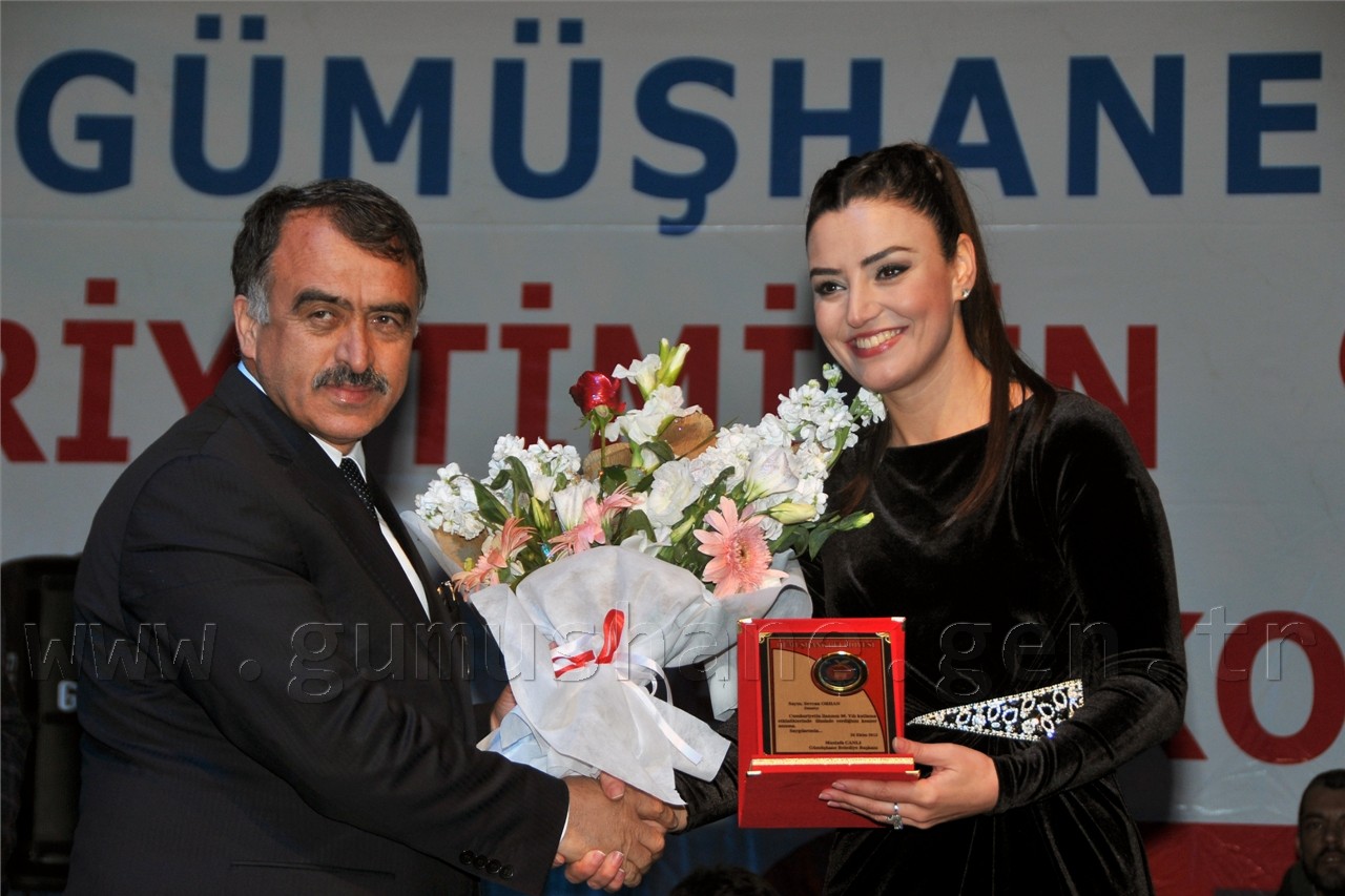 Sanatçıya çiçek ve plaket takdim eden Gümüşhane Belediye Başkanı Mustafa Canlı ise, “Bu ülkeyi bize bağışlayan, bu ülkede bizim bağımsız bir şekilde yaşamamızı sağlayan ve Cumhuriyetimizin temellerini atan başta Ulu Önder Mustafa Kemal Atatürk olmak üzere bütün şehitlerimizi saygı ve rahmetle anıyoruz. Ruhları şad olsun.” dedi.